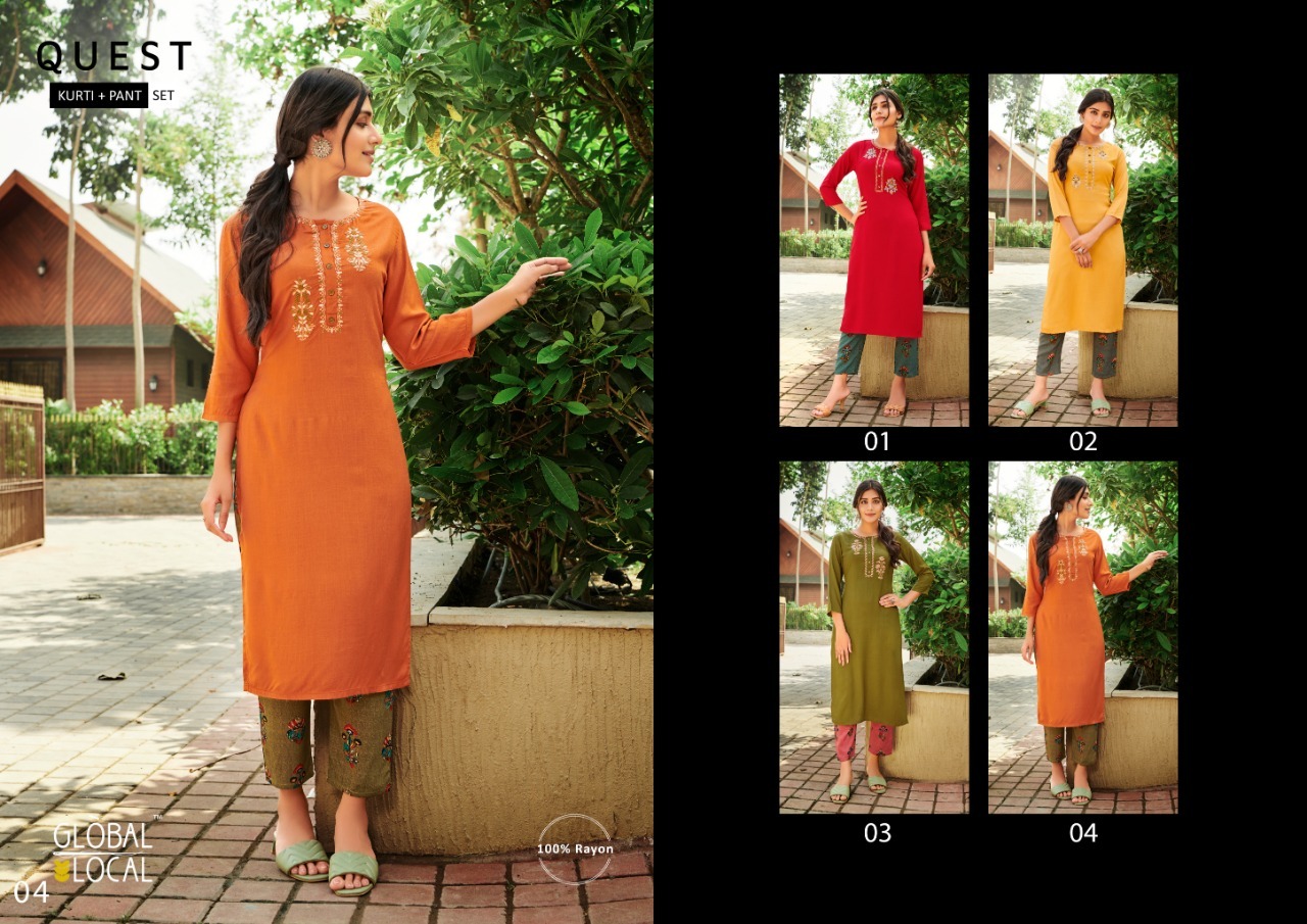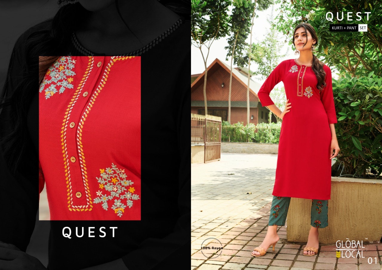 | DETAILS | *Fabric Details* BRAND : GLOBAL LOCAL™️ TYPE : Embroidered kurtis in 100% rayon with foil printed pantsSIZES : S to 2XL |