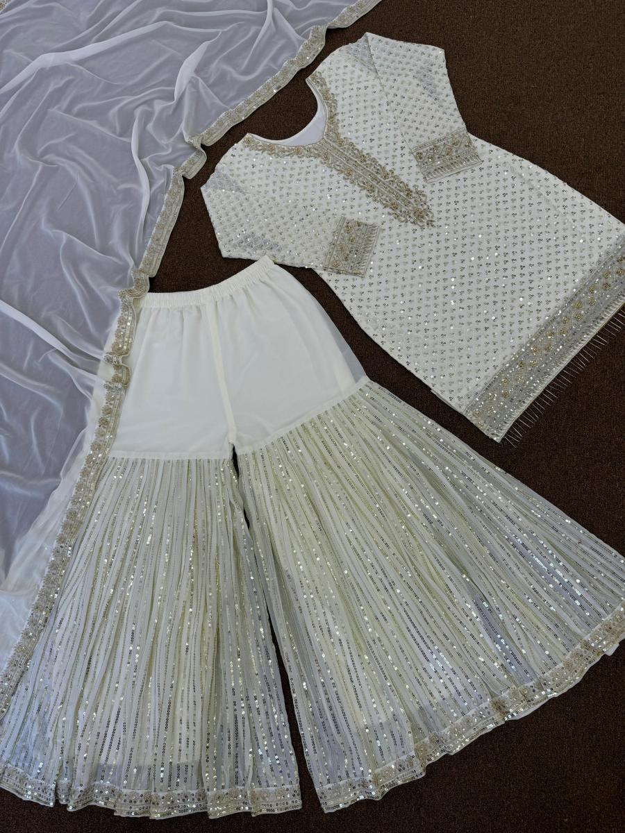 | FABRIC DETAILS | TOP # Top Fabric : Heavy Faux Georgette And Full Sleeve With Work # Top Work : Heavy Fancy Embroidery And 5mm Sequins Work With Latkan Lace Work (Only Front Side Work)# Top Inner : Micro Cotton # Top Length : 32-34 Inc # Top Size : 42 XL (Full Stitched) XXL Margin SHARARA # Sharara Fabric : Heavy Faux Georgette # Sharara Work : Heavy Fancy Embroidery And 5mm Sequins Work # Sharara Inner : Micro Cotton # Sharara Length : 40-41 Inc (Fully Stitched) Up To XXL DUPATTA # Dupatta Fabric : Heavy Faux Georgette With Embroidery And 5mm Sequins Lace Border # Dupatta Length : 2.10 Mtr |