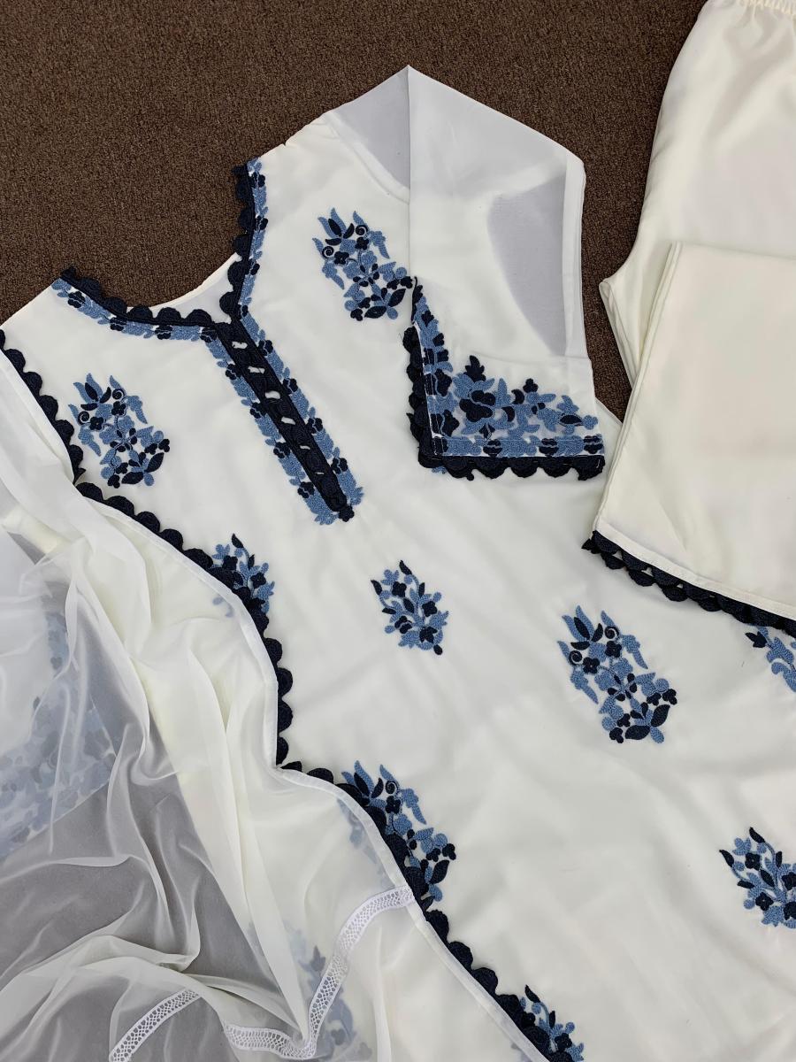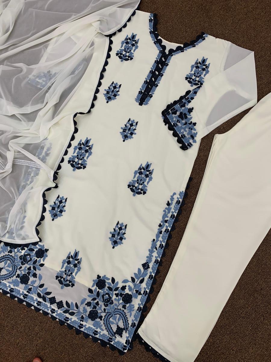 | FABRIC DETAILS | Kurti # Kurti Fabric : Faux Georgette And Sleeve With Cut Work # Kurti Work : Fancy Heavy Embroidery Work And GPO Lace Border (Only Front Side Work)# Kurti Inner : Micro Cotton # Kurti Length : 47 Inc # Kurti Size : 42 XL Free Size (Full Stitched ) XXL Margin Pent # Pent Fabric : Soft Butter Silk With GPO Lace Border # Pent Length: 40-42 Inc (Fully Stitched) Up To XXL Dupatta # Dupatta Fabric : Faux Georgette With Fancy GPO Lace Border # Dupatta Length : 2.10 Mtr |