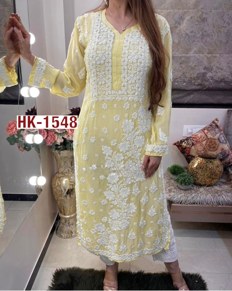 FABRIC DETAILS :- * Kurti * # Kurti Fabric : Faux Georgette And Full Sleeve With Work # Kurti Work : Heavy Embroidery Chikankari Work (Only Front Side Work)# Kurti Inner : Micro Cotton # Kurti Length : 47 Inc # Kurti Size : M(38), L(40), XL(42), XXL(44) (*Full Stitched*) * Plazzo * # Plazzo Fabric: Faux Georgette With Fancy Embroidery Chikankari Work With Real Mirror Hand Work # Plazzo Inner: Micro Cotton # Plazzo Length: 40-42 Inc (Fully Stitched) Up To XXLHK 1548 D DESIGNER SUITS MANUFACTURER