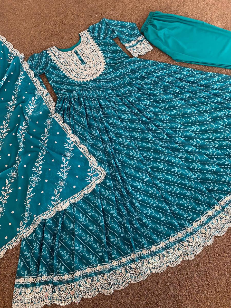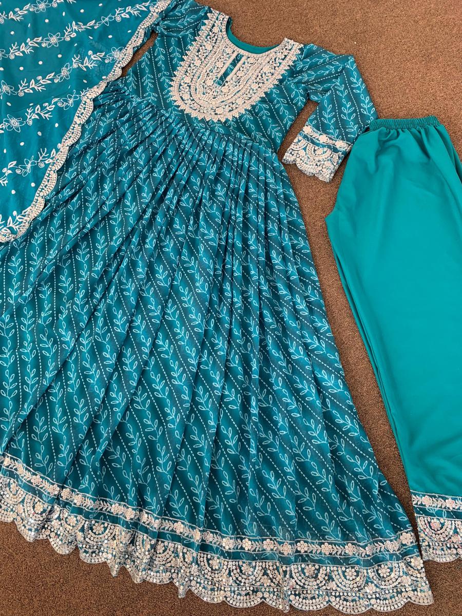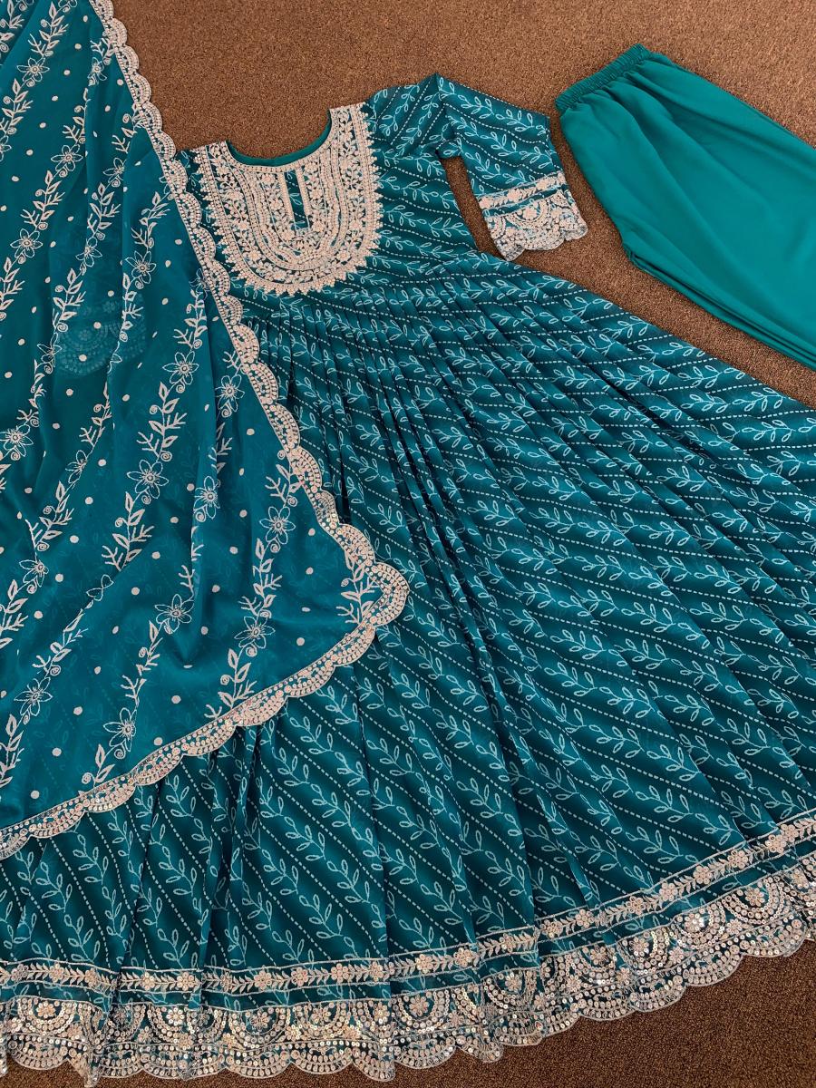 | FABRIC DETAILS | Gown Fabric : Faux Georgette With Full Sleeve And Work Gown Work : Fancy Digital Printed With Embroidery And 5mm Sequins Work Gown Inner : Micro Cotton Gown Flair : 3 Mtr Gown Size : 42 XL Free Size (Full Stitched ) XXL Margin Gown Length : 56-57 Inc Bottom Fabric : Heavy Butter Silk With Embroidery Sequins Work Lace Border Bottom Length: 40-42 Inc (Fully Stitched) Up To XXLDupatta Fabric : Faux Georgette With Fancy Digital Printed And Embroidery With 5mm Sequins Work Lace Border Dupatta Length : 2.10 mtr |
