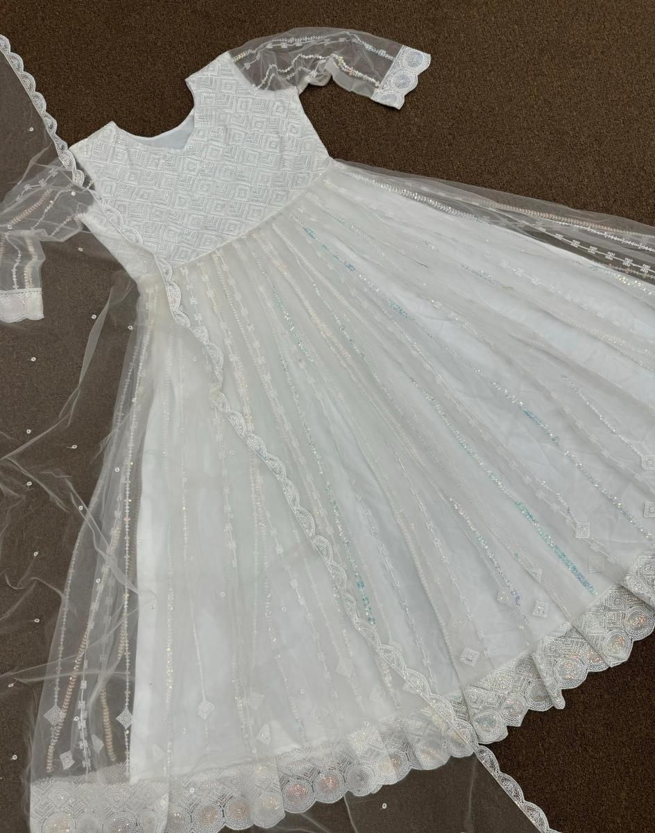 | FABRIC DETAILS | Gown Fabric : Heavy Soft Butterfly Net And Sleeve With Heavy Work Gown Work : Fancy Heavy Embroidery Thread And Sequins Work Gown Inner : Micro Cotton Gown Size : 42 XL Free Size (Full Stitched) XXL Margin Gown Length : 58 Inc Gown Flair : 3 Mtr Flair Dupatta Fabric : Heavy Soft Butterfly Net With Fancy Embroidery Thread And Sequins Work With Lace Border Dupatta Length : 2.10 Mtr |