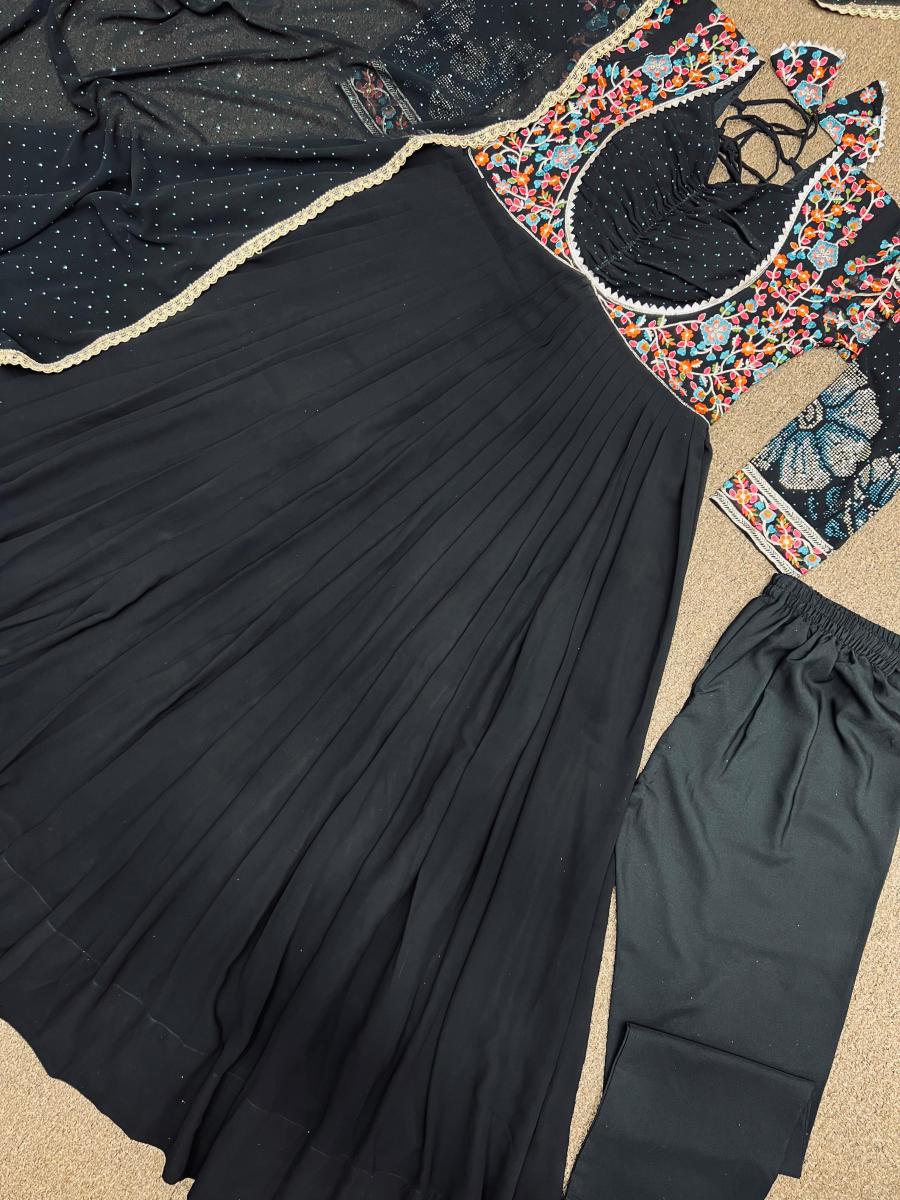 | FABRIC DETAILS | Gown Fabric : Heavy Faux Georgette And Sleeve With Work Gown Work : Fancy Embroidery And Hot Fix Stone Work With Backside Fancy Pattern And Stitched Pad Gown Inner : Micro Cotton Gown Size : M(38), L(40), XL(42), XXL(44) (Full Stitched) Gown Length : 55-56 Inc Gown Flair : 3 Mtr Flair Bottom Fabric : Soft Butter Silk Bottom Length: 40 Inc (Fully Stitched) Up To XXL Dupatta Fabric : Heavy Faux Georgette With Hot Fix Stone Work And Fancy Lace Bordr Dupatta Length : 2.10 Mtr |