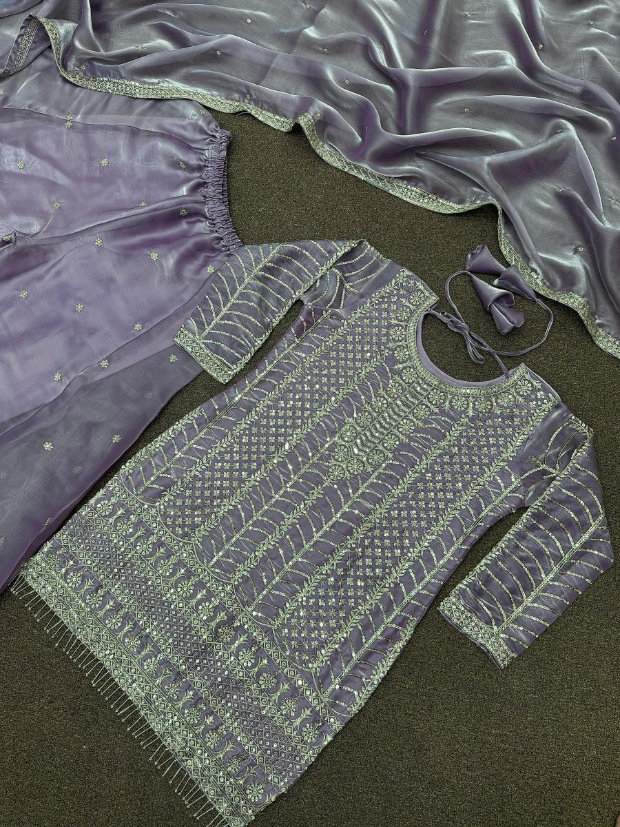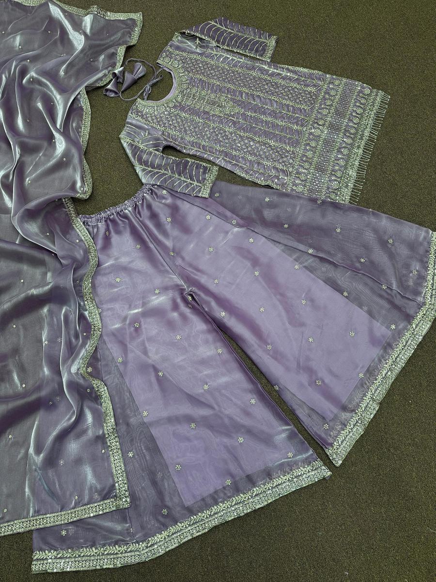 | FABRIC DETAILS | Top # Top Fabric : Pure Jimmy Choo Silk And Sleeve With Heavy Work # Top Work : Fancy Heavy Embroidery And Sequins Work With Latkan Lace Border (Only Front Side Work)# Top Inner : Micro Cotton # Top Length : 35-36 Inc # Top Size : 42 XL Free Size (Full Stitched) XXL Margin Plazzo # Plazzo Fabric : Pure Jimmy Choo Silk With Embroidery And Sequins Work # Plazzo Inner : Micro Cotton # Plazzo Length: 40-42 Inc (Fully Stitched) Up To XXL Dupatta # Dupatta Fabric : Pure Jimmy Choo Silk With Embroidery And Sequins Work # Dupatta Length : 2.10 Mtr |