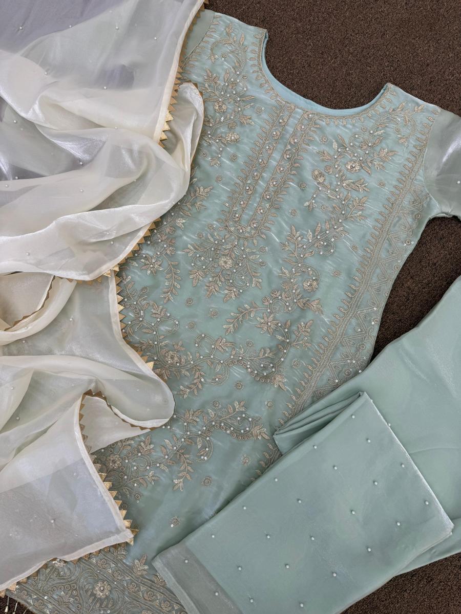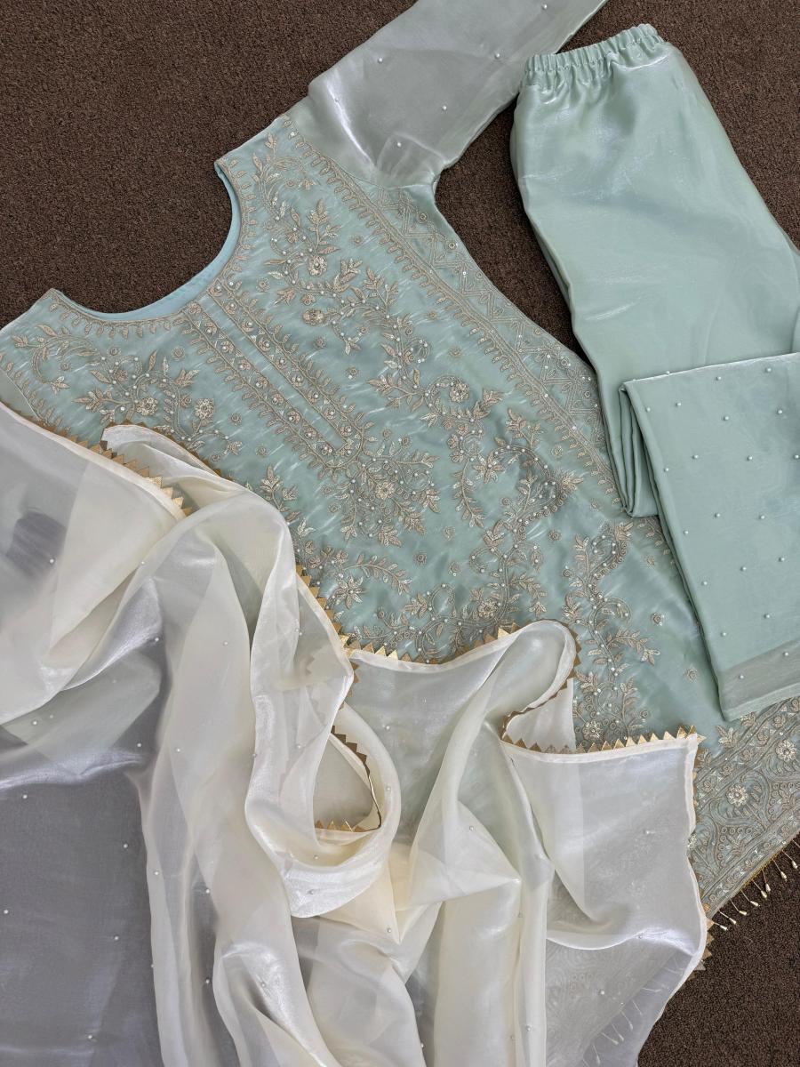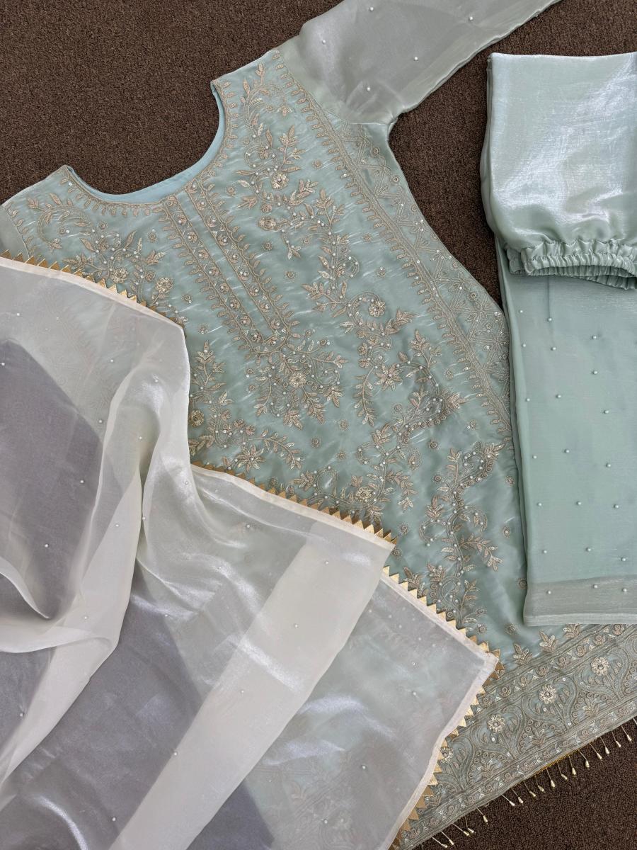 | FABRIC DETAILS | Kurti # Kurti Fabric : Pure Jimmy Choo Silk And Sleeve With Riveted Moti # Kurti Work : Fancy Heavy Embroidery And Sequins Work With Riveted Moti Work And Latkan Lace Border (Only Front Side Work)# Kurti Inner : Micro Cotton # Kurti Length : 37 Inc # Kurti Size : 42 XL Free Size (Full Stitched) XXL Margin Pent # Pent Fabric : Pure Jimmy Choo Silk With Riveted Moti Work # Pent Inner : Micro Cotton # Pent Length: 40 Inc (Fully Stitched) Up To XXL Dupatta # Dupatta Fabric : Pure Jimmy Choo Silk With Riveted Moti Work And Fancy Lace Border # Dupatta Length : 2.10 Mtr |