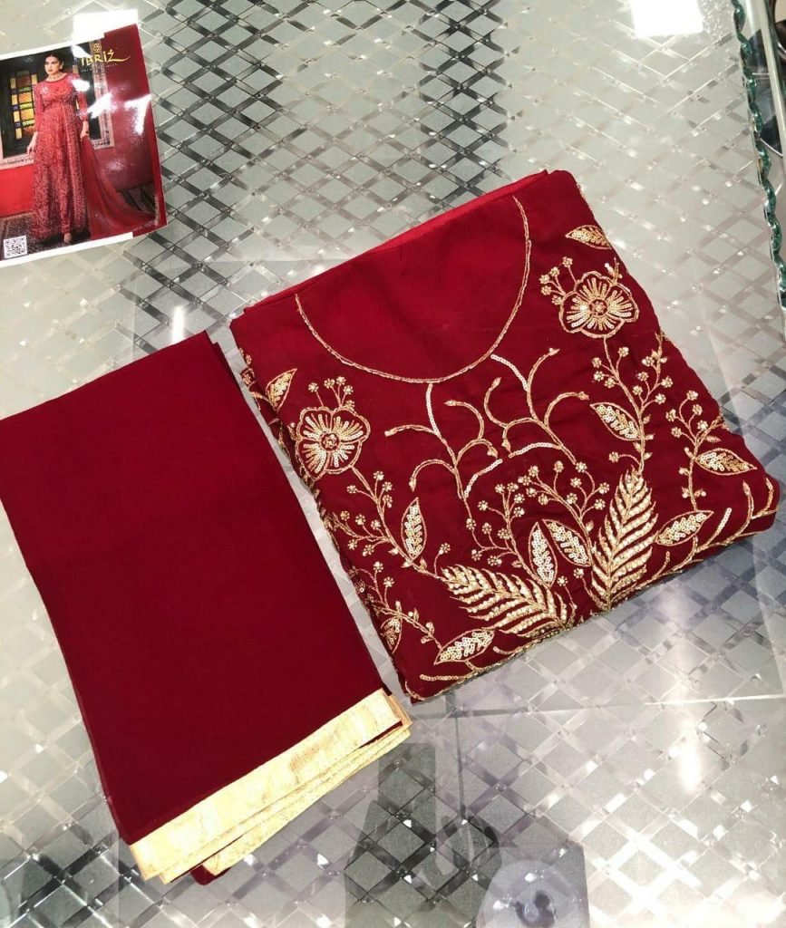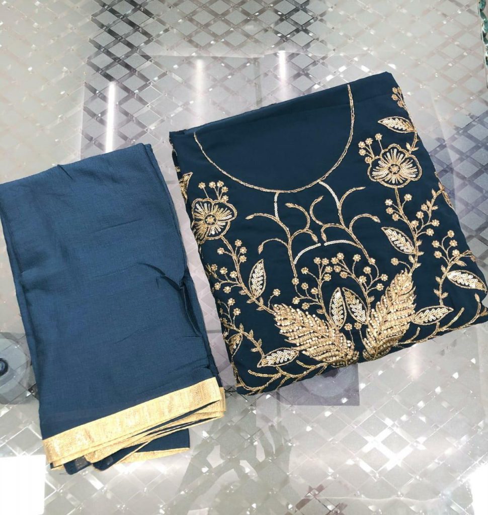 | DETAILS | 👚TOP – *Georgette* with beautiful Heavy Embroidery & zari Sequence work with Daimond work all over *(INCLUDING SLEEVES)* 👖INNER & BOTTOM – *SANTON* 👘DUPATTA – *FINE CIFFON* with beautiful Four side Gota Lace |