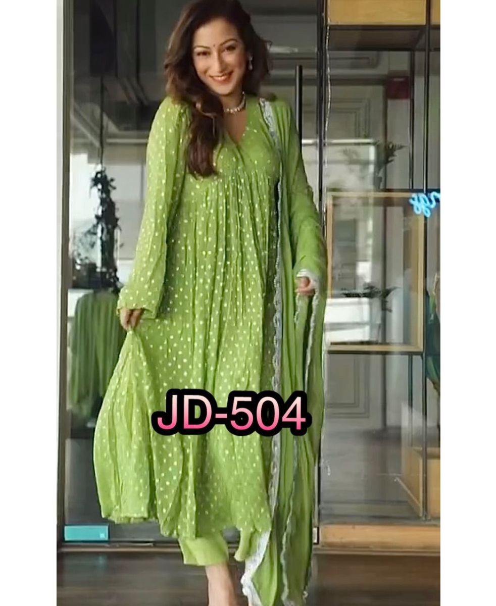 | FABRIC DETAILS | GOWN GOWN FABRIC : HEAVY FAUX GEORGETTE AND FULL SLEEVE. GOWN WORK :- ATTRACTIVE EMBROIDERY SEQUENCE WORK GOWN INNER : HEAVY MICRO COTTON GOWN LANGTH : 53-54 INC GOWN SIZE : - M size with L size margin, XL size with XXL margin GOWN FLAIR:- 3 mtr (full stitched ) PENT # PENT FABRIC : Heavy butter silk # PENT LENGTH: 40-42 INC (fully stitched) DUPATTA # DUPATTA FABRICS : HEAVY FAUX GEORGETTE PLAIN DUPATTA WITH READY MADE LACE. # DUPATTA LENGTH : 2.10 MTR |