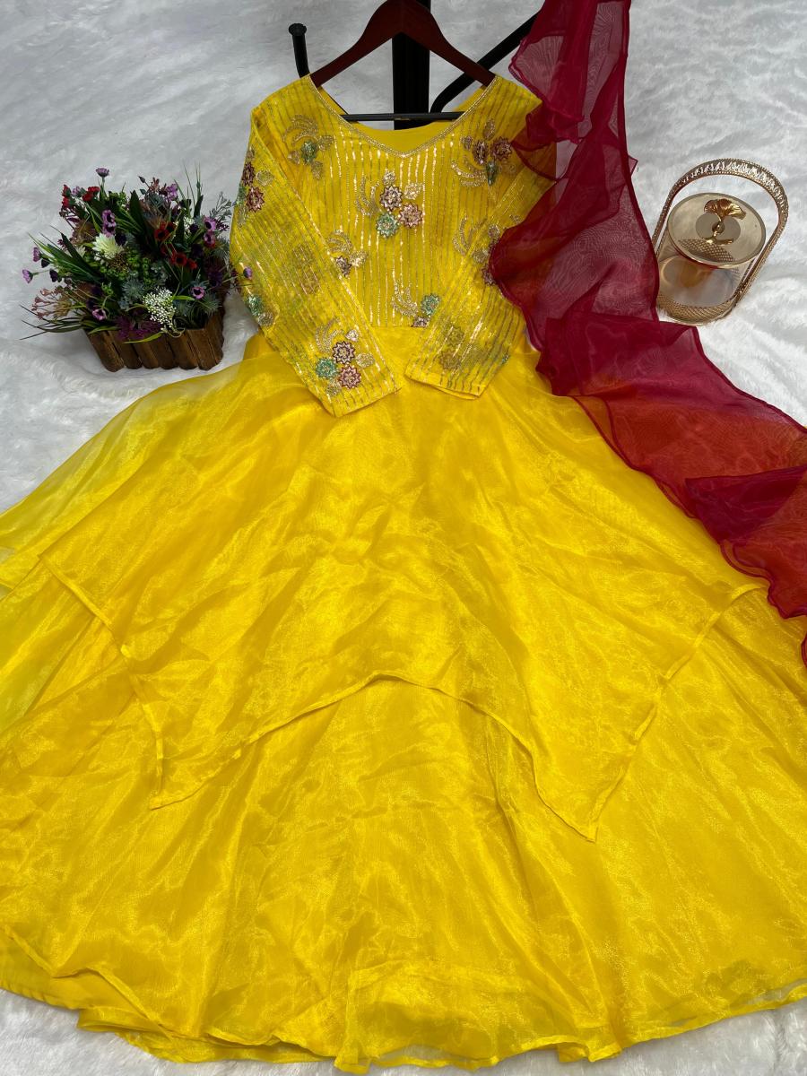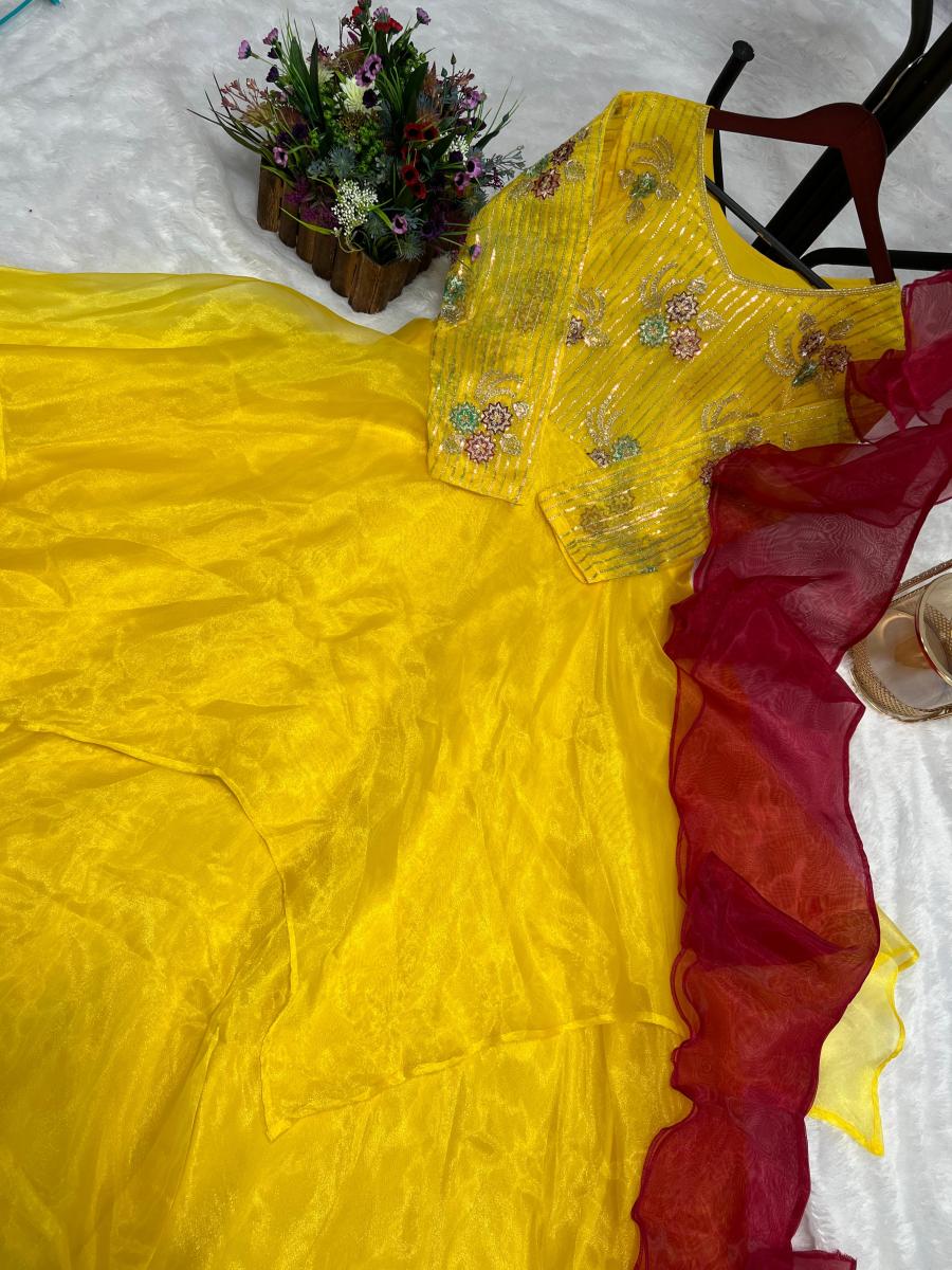 | FABRIC DETAILS | GOWN FABRIC :- HEAVY ORGANZA SILK. WORK :- ATTRACTIVE EMBROIDERY SEQUENCE WORK. (ONLY FRONT SIDE)INNER : HEAVY MICRO COTTON LANGTH : 56- 57 INCH SIZE : -M size with L margin XL with XXL marginDUPATTA FABRIC :- HEAVY ORGANZA SILK RUFFLE DUPATTA. LENGTH :- 2.10 MTR |