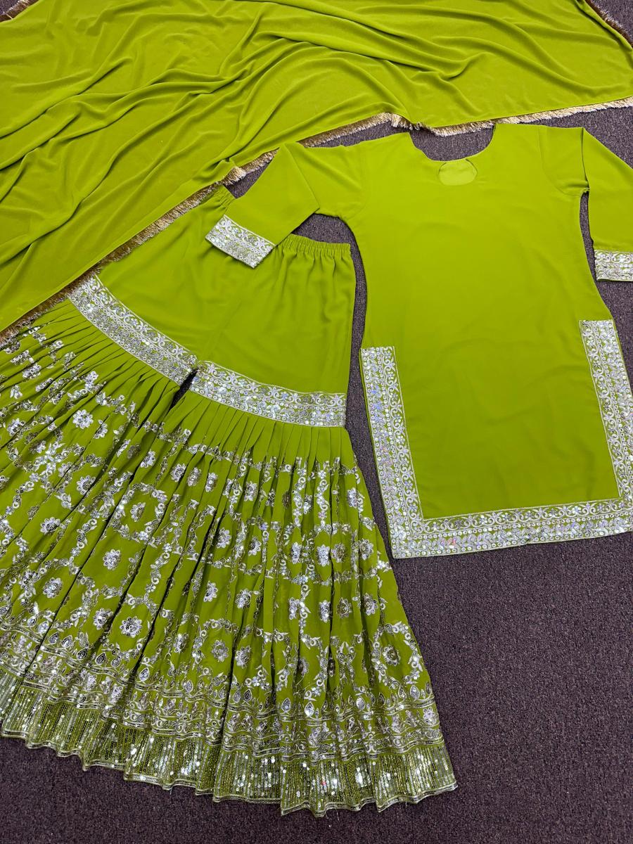 | FABRIC DETAILS | KURTI FABRIC :- HEAVY FAUX GEORGETTE. WORK :- ATTRACTIVE EMBROIDERY SEQUENCE WORK. INNER : HEAVY MICRO COTTON LANGTH :- 32-34 INC SIZE : - FREE SIZE (XL with XXL margin)SHARARA FABRIC :- HEAVY FAUX GEORGETTE. INNER :- HEAVY MAICRO COTTON. WORK :- BEUTYFUL HEAVY EMBROIDERY SEQUENCE WORK. LENGTH :- 40-42 inchDUPATTA FABRIC :- HEAVY FAUX GEORGETTE. WORK :- READY MADE LACE BORDER LENGTH :- 2.10 MTR |