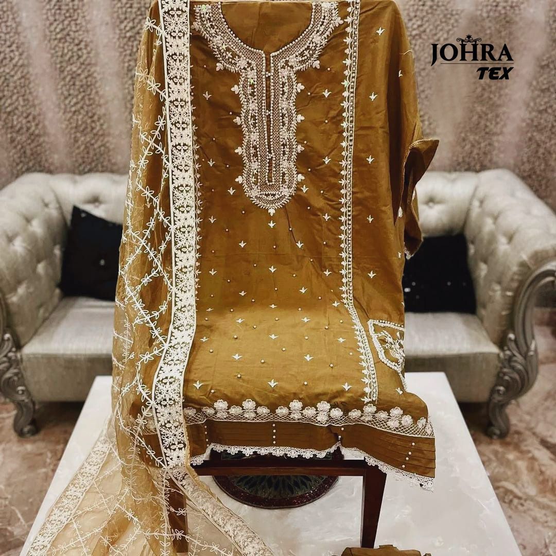 FABRIC DETAILS :- Top :-CAMBRIC COTTON WORK HEAVY EMBROIDERY WORK WITH PEARL(Moti)WORKDupatta :-NET HEAVY EMBROIDERY WORKBottom :- CAMBRIC COTTONJOHRA TEX 116 A PAKISTANI SALWAR SUITS