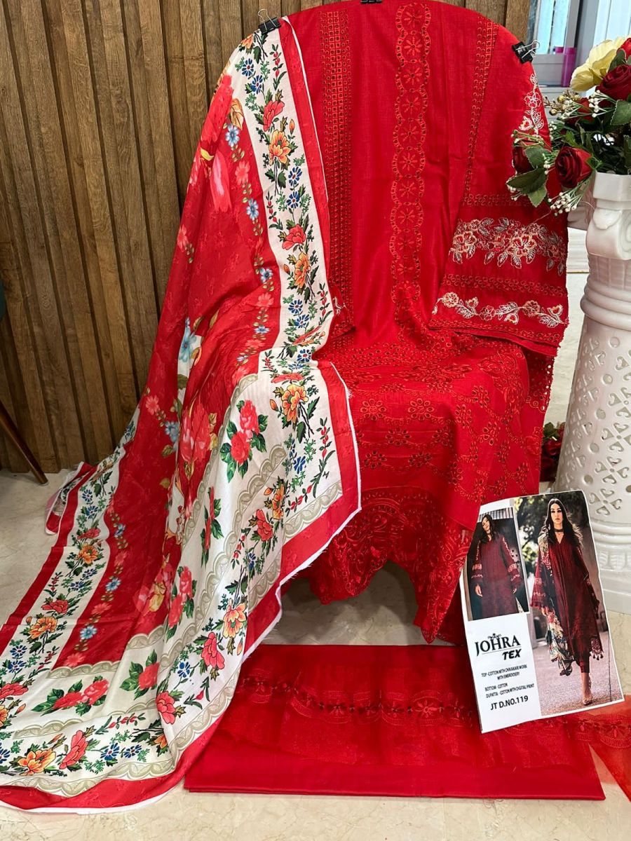 FABRIC DETAILS :- Top :- CAMBRIC COTTON HEAVY CHIKAKARI WORK WITH EMBROIDERYDupatta :-COTTON WITH DIGITAL PRINTBottom :- CAMBRICJOHRA TEX JT 119 PAKISTANI SUITS IN INDIA
