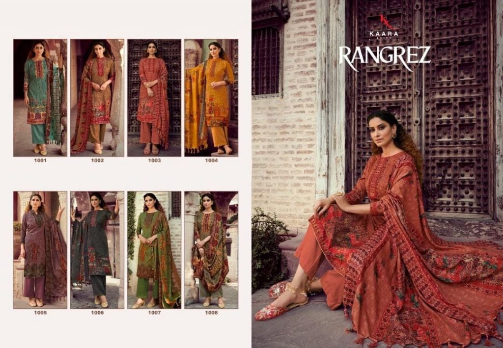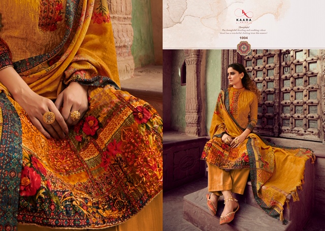 | DETAILS | *RANGREZ* Pasmina by KAARA SUITS Top :- 100% Pure Pasmina Print With Heavy Fancy Aari Embroidery Work Bottom :- Pure Pasmina Solid Duptta :- Pure Bemberg Chiffon Print Designs :- 8 *Rate :- *599/- (Bemberg Chiffon)* |
