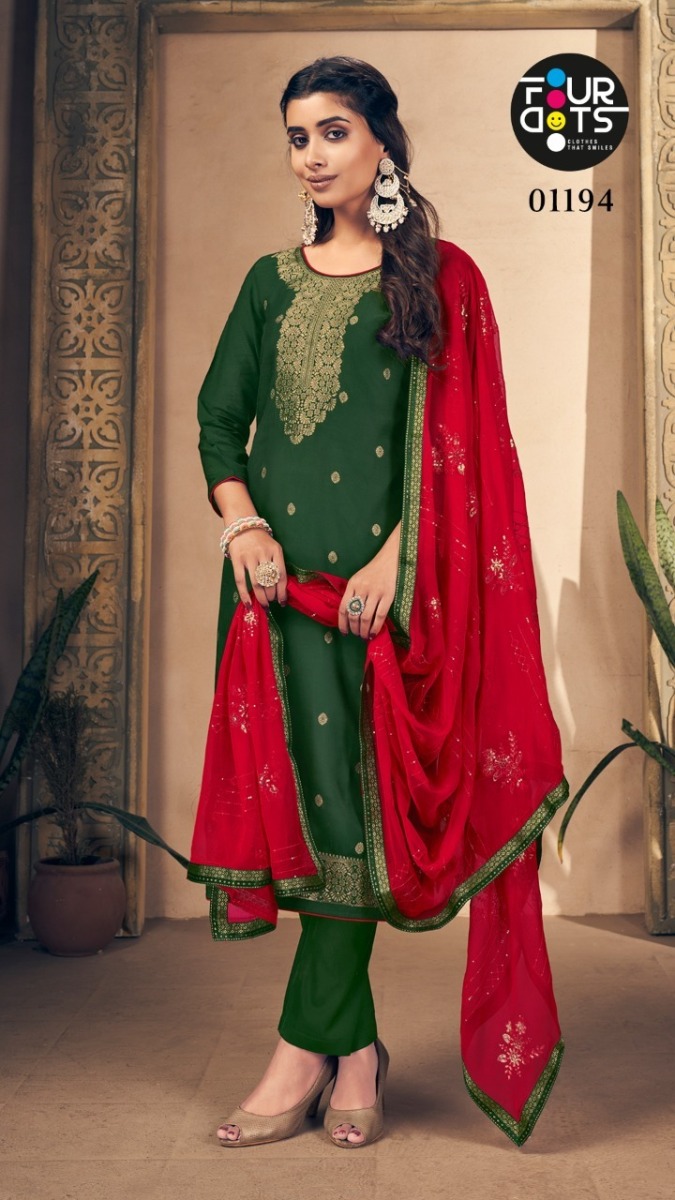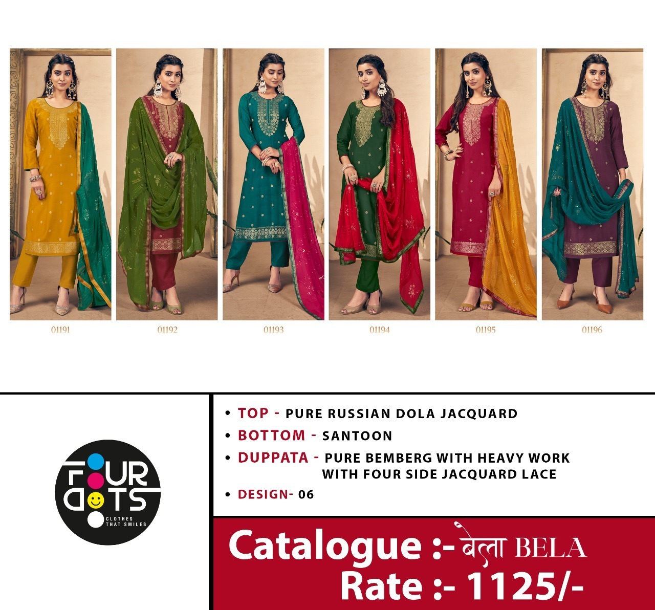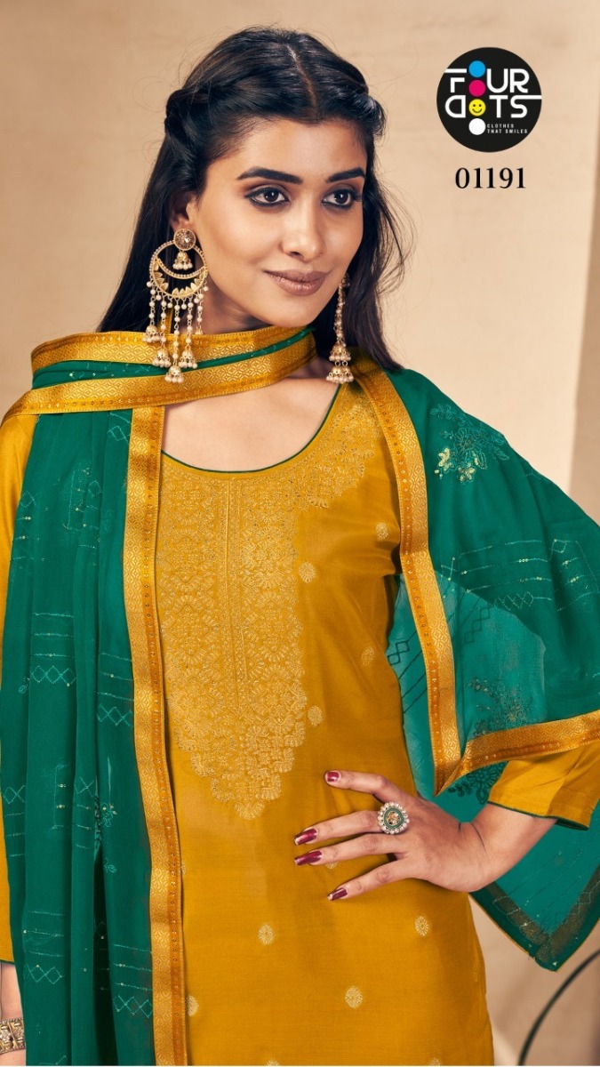 | DETAILS | **Fabric Details Top:- *Pure Russian Dola Jacquard* BOTTOM:- *Santoon* Dupatta:- *Pure Bemberg With Heavy Work With Four Side Jacquard Lace*Total Design:- 4 |