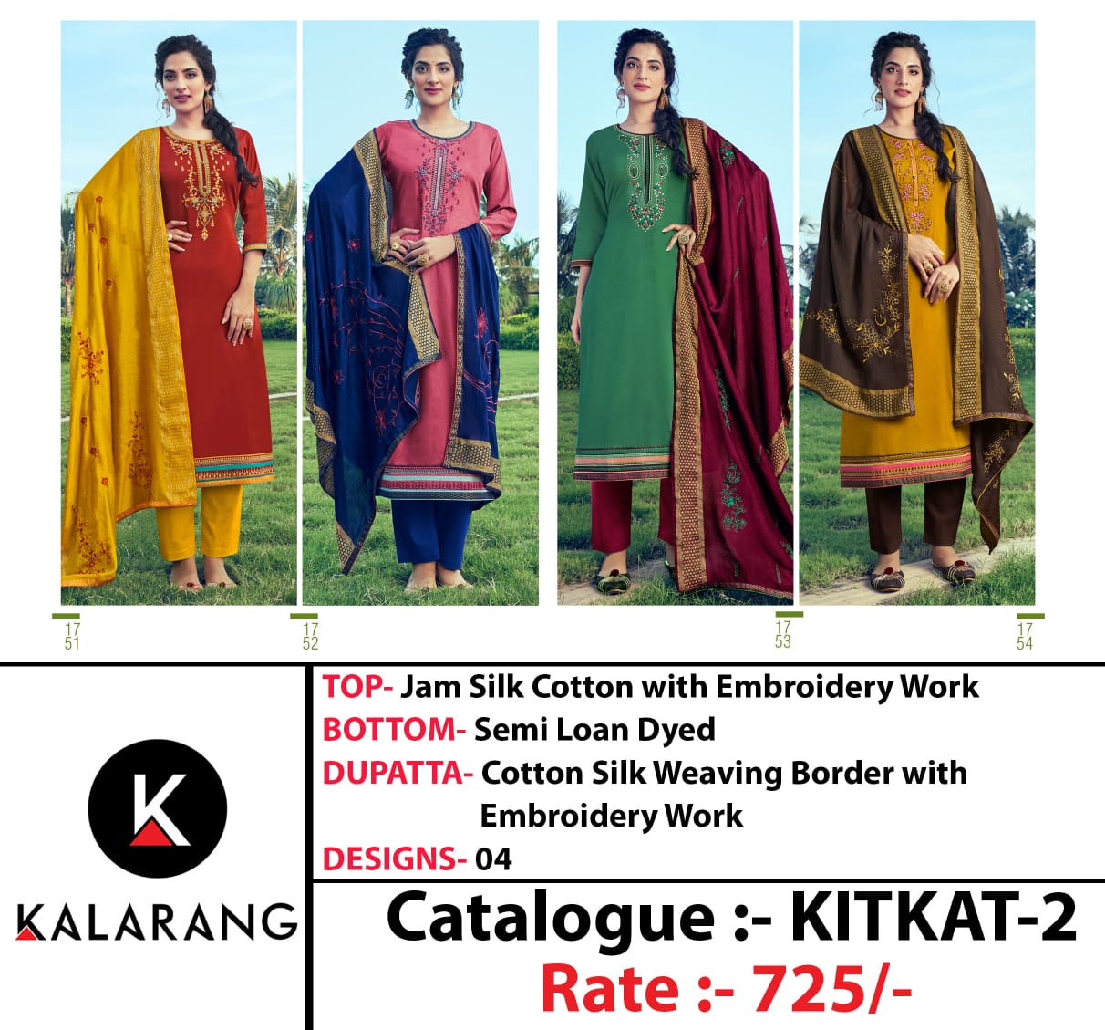 | DETAILS | Top:- Jam Silk Cotton With Embroidery Work |