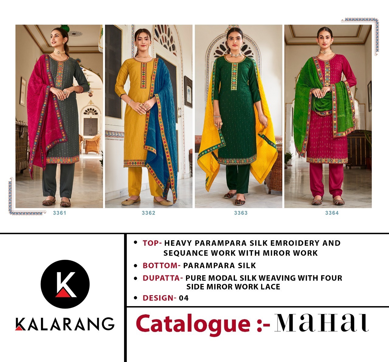 | DETAILS | Fabric Details Top:- Heavy Parampara Silk Embroidey And Sequance Work With Miror Work Bottom- Parampara Silk Dupatta:- Pure Modal Silk Weaving With Four Side Miror Work Lace |