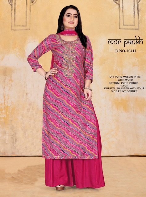 | DETAILS | **Fabric Details Top:- *Pure Muslin Print With Work* Bottom:- *Pure Viscos Reyon* Dupatta:- *Najneen With Four Side Print Border*Total Design:- 04 ** |
