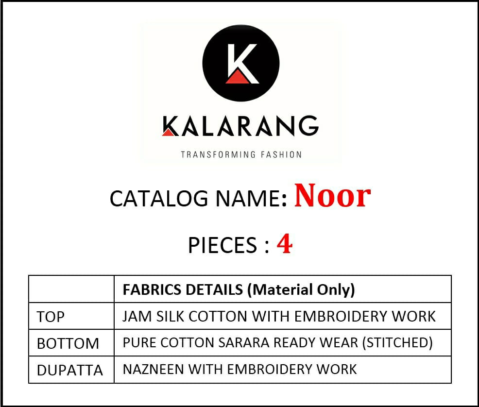 | DETAILS | Kalarang.* has launched _Catalog name_ : *Noor* ? _Fabric Details_ ? ▪Top:- JAM SILK COTTON |