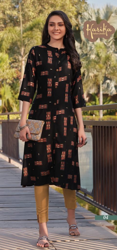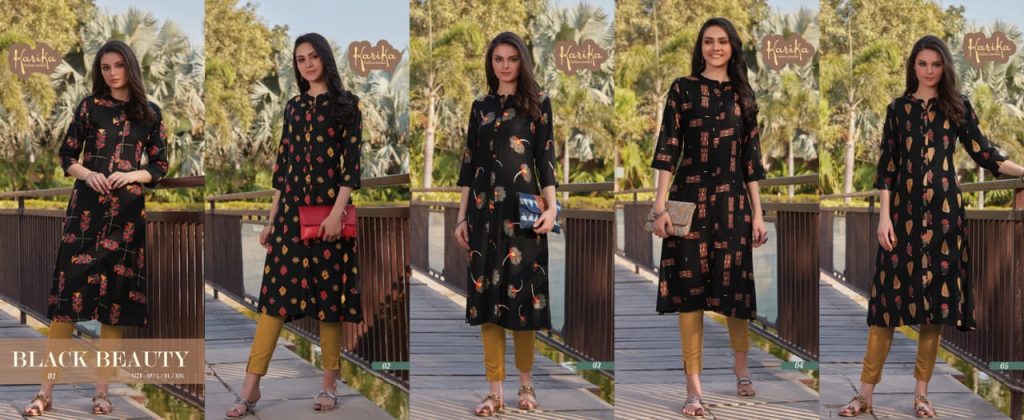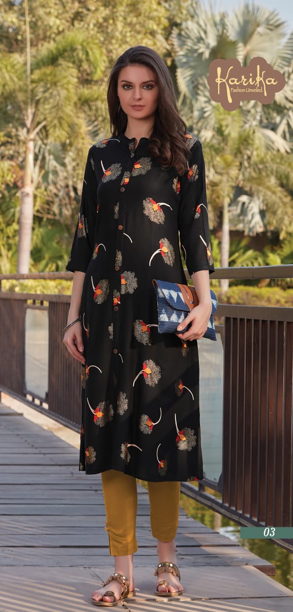 | DETAILS | *Karika* Catalog : *Black Beauty* Kurti. : *Rayon Discharge Foil* Price. : *445/-* |