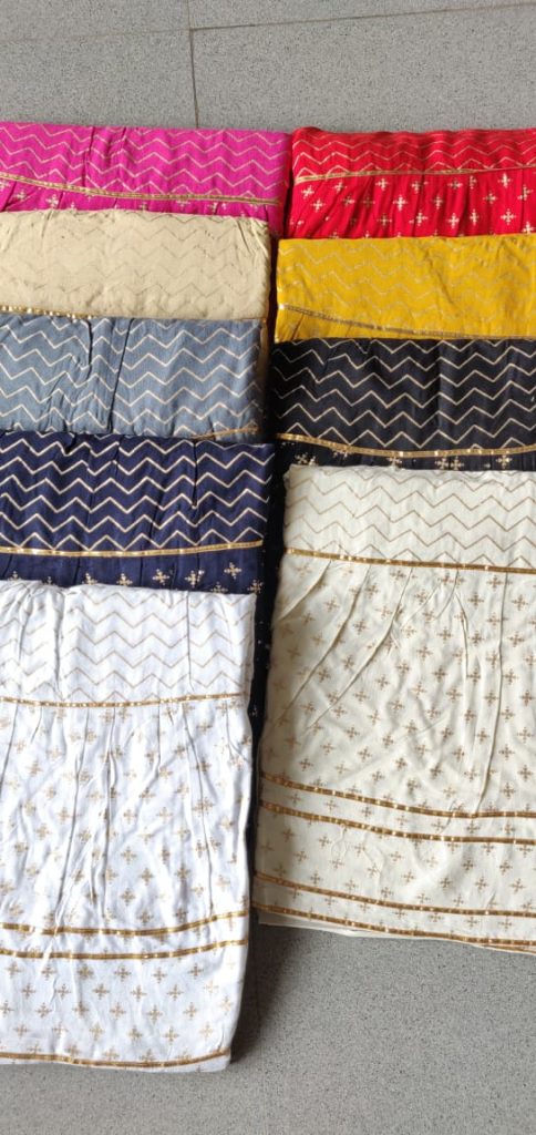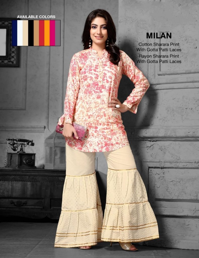 | DETAILS | Kavyansika Launching Premiun Rayon or Cotton Sharara print with Gotta patti laces Free size. Available in 9 colours. 9 colour set Cotton fabric rate 335/- |