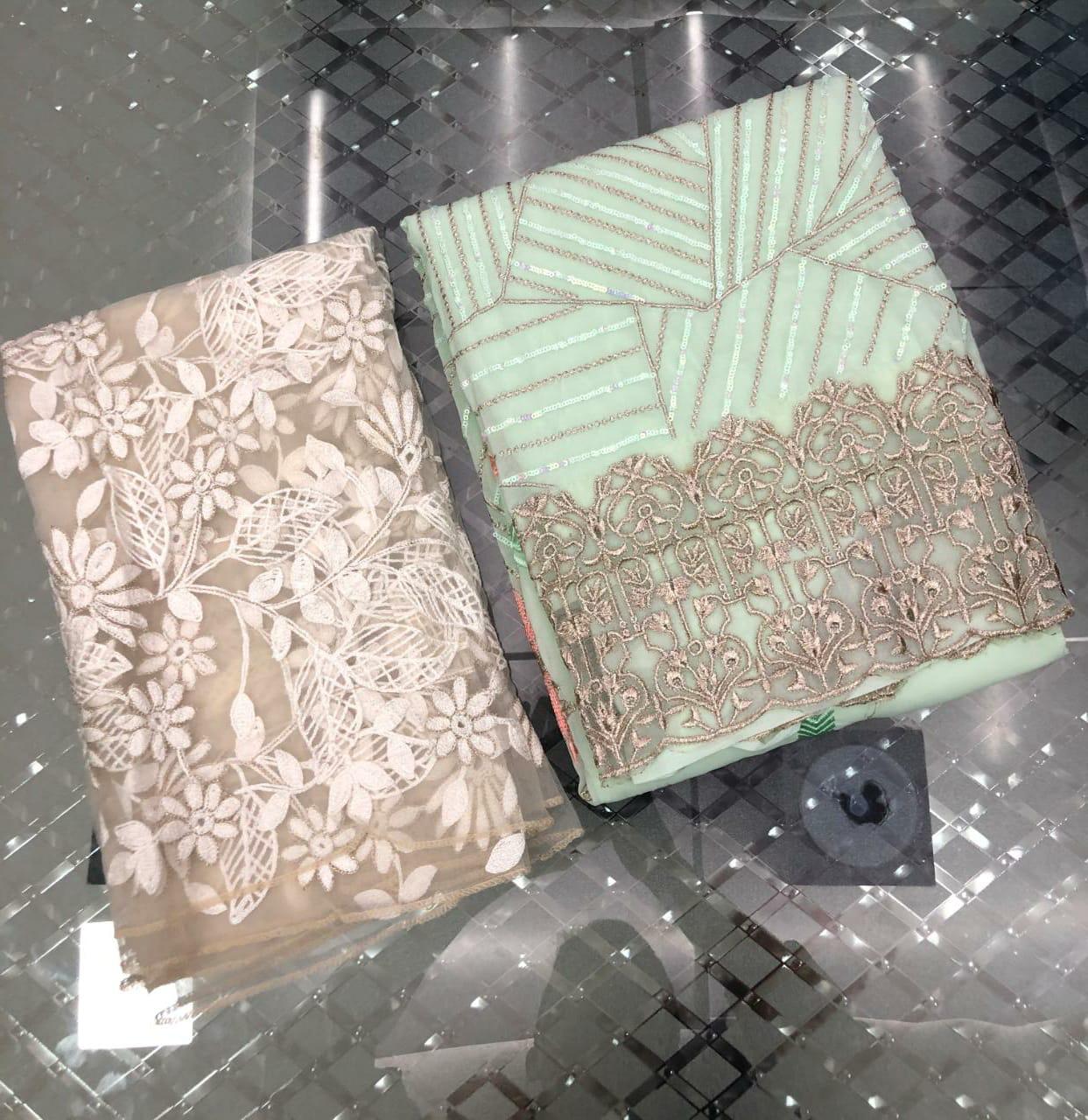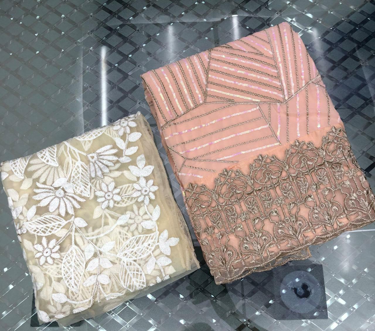 | DETAILS | ?TOP – *Georgette* with beautiful *multicolored sequence* and *embroidery* work all over *(INCLUDING SLEEVES)* ?INNER & BOTTOM – *Santon* with patch work ?DUPATTA – *Super net* with beautiful *embroidery work* ?TYPE – *Semi-stitched* |