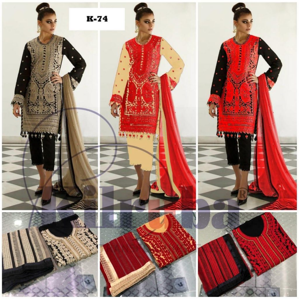 | DETAILS | TOP – *Georgette with beautiful & heavy chain stitched embroidery work all over* ?INNER & BOTTOM – *Santoon* ?DUPATTA – *Super net with heavy lace and mottis all over* |