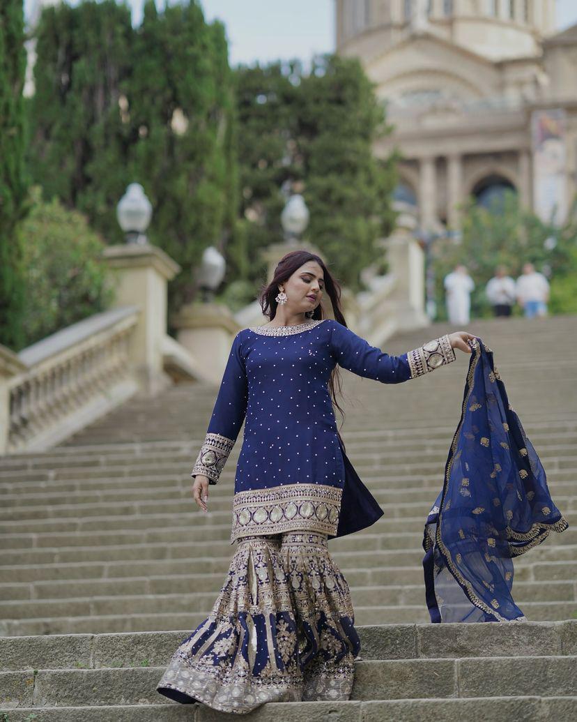 SHARARA : HEAVY GEORGETTE WITH FULLY EMBROIDERY WORK & REAL MIRROR WORK (FULLY STITCHED)
