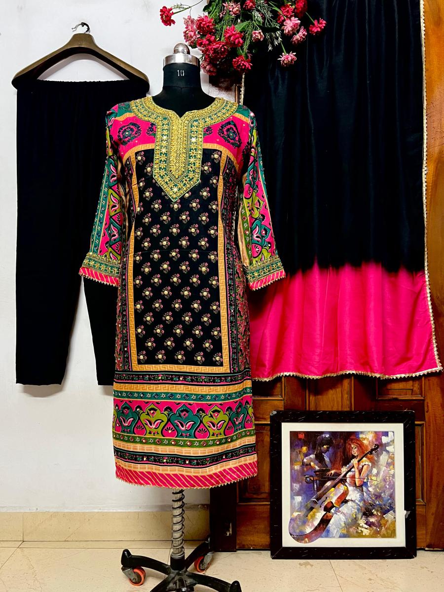 | FABRIC DETAILS | DUPATTA: HEAVY MUSLIN COTTON WITH DIGITAL PRINTED & HAND WORK TOP : HEAVY MUSLIN COTTON WITH DIGITAL PRINT , EMBROIDERY & STONE WORK & REAL MIRROR WORK (FULLY STITCHED) PLAZZO: HEAVY SILK (FULLY STITCHED) INNER : HEAVY SILKSIZE DETAILS:- Top Fullystitched up to 44 Size Top length 42 inches Plazzo Fully stitched up to xxl Size |