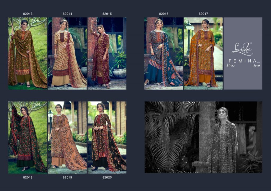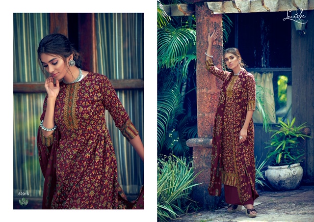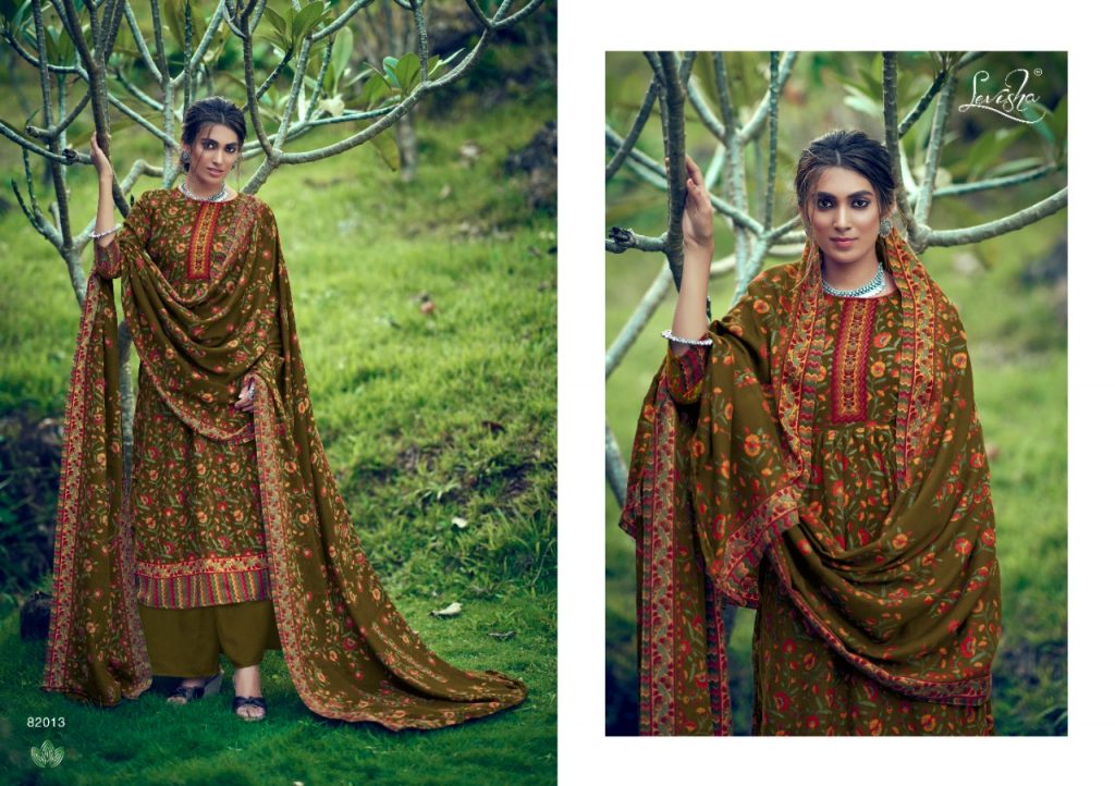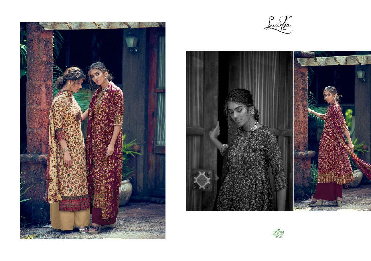 | DETAILS | LEVISHA ®️ BRAND _presents_ *”Femina vol-9”* ?Top: Pure Pashmina **kani print**. (2.50 mtrs) ?Dupatta: Pure Pashmina Shawl printed (2.30 mtr) ?Bottom: Pure pashmina (3 mtrs apx) |