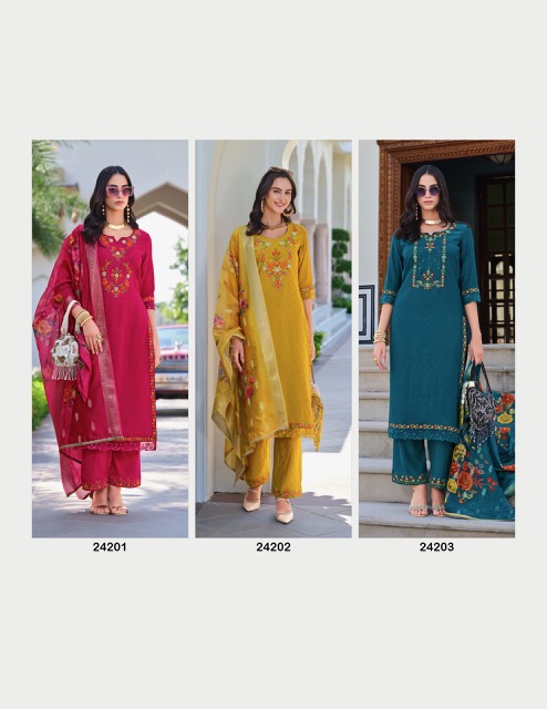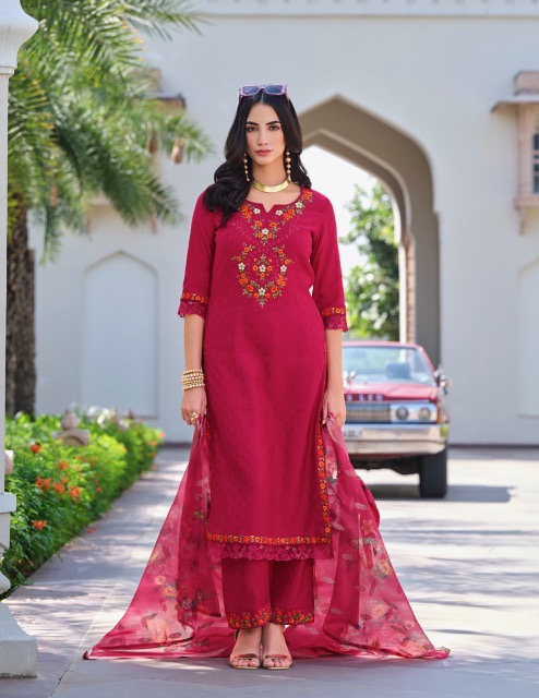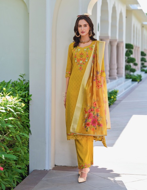 | DETAILS | **FABRIC DETAILS:- Top – HANDWORK AND EMBROIDERY ON SELF JACQUARD VISCOUSE SILK WITH COTTON INNER Bottom – PLAZZOS ON SELF JACQUARD VISCOUSE SILK WITH EMBROIDERY LACE Dupatta ORGANZA JACQUARD DIGITAL PRINT DUPATTA WITH FANCY LACE |