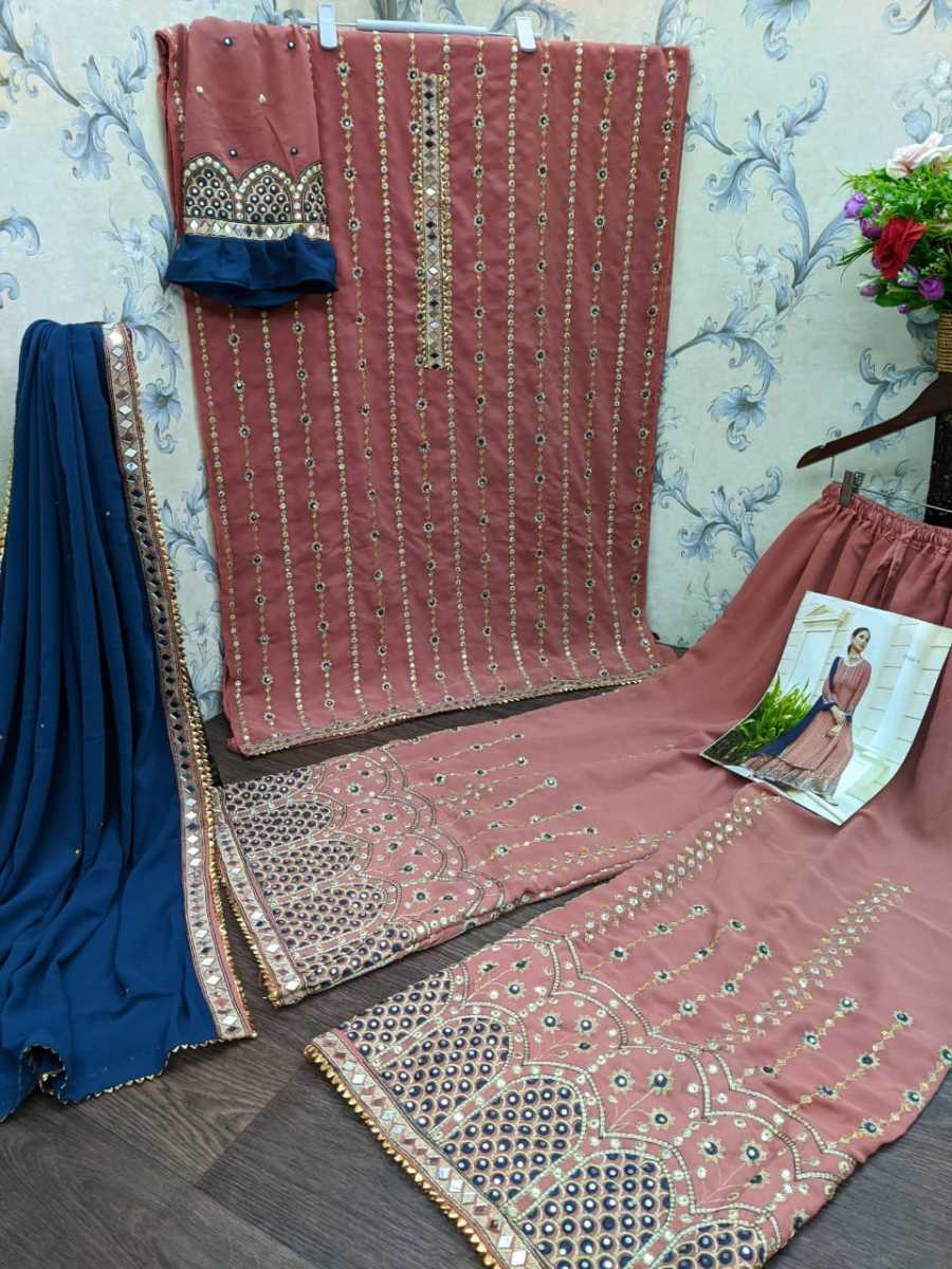 Top* :- Heavy Faux Georgette with Embroidery work + Daimond and real mirror Sleeves* :- Heavy Faux Georgette with Embrodery work + Daimond with Real Mirror Top inner*:- Dull Santoon Top Length*:- 44 to 45'' Plazo*:- Heavy faux Georgette with embroidery work +Daimond and real mirror Plazo inner*:- Dull santoon Dupatta* :- Heavy Faux Georgette dupatta with embroidery work + Daimond and real mirror
