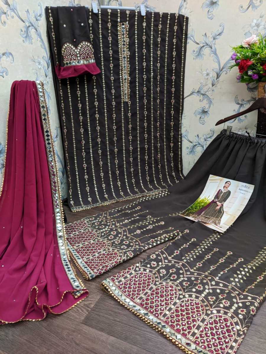 Top* :- Heavy Faux Georgette with Embroidery work + Daimond and real mirror Sleeves* :- Heavy Faux Georgette with Embrodery work + Daimond with Real Mirror Top inner*:- Dull Santoon Top Length*:- 44 to 45'' Plazo*:- Heavy faux Georgette with embroidery work +Daimond and real mirror Plazo inner*:- Dull santoon Dupatta* :- Heavy Faux Georgette dupatta with embroidery work + Daimond and real mirror