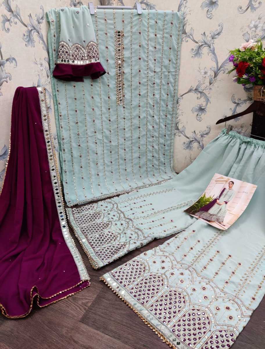 Top* :- Heavy Faux Georgette with Embroidery work + Daimond and real mirror Sleeves* :- Heavy Faux Georgette with Embrodery work + Daimond with Real Mirror Top inner*:- Dull Santoon Top Length*:- 44 to 45'' Plazo*:- Heavy faux Georgette with embroidery work +Daimond and real mirror Plazo inner*:- Dull santoon Dupatta* :- Heavy Faux Georgette dupatta with embroidery work + Daimond and real mirror