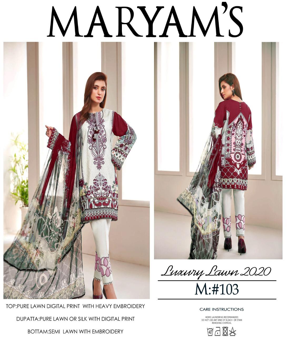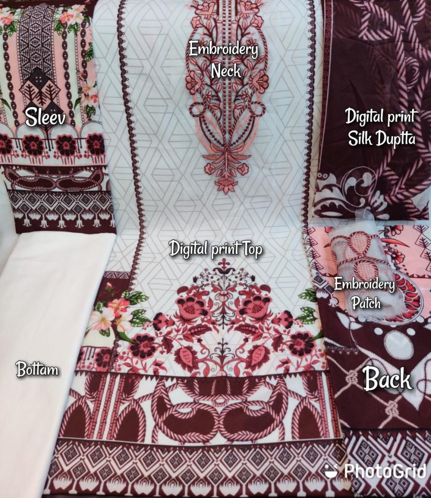 | DETAILS | MARYAM’S LUXURY LAWN COLLECTION COLOR ADDITION ?? *Fabric Details* ?? ▪ *Top : Luxury Lawn Digital Print with heavy Self Embroidery* ▪ *Sleeves : luxury lawn digital print* ▪ *DUPATTA*: ▪ *Bottom : Original Lawn cotton (Soft Fabric)* *( Embroidery patch in all pieces*) *2 PCS SET* *Price:- Rs 949/-* |