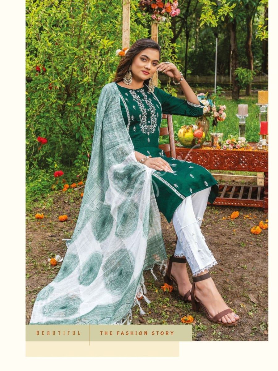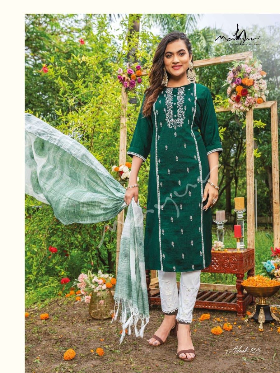 | DETAILS | **Fabric Details* No of Adaah Garments : 8 Sizes available : M L XL 2XLKurti - New Chinnon lining - 44-45"Pant - Super soft Lycra with Designer Lace Patterns - 38-39"Dupatta - Silk Sequence with Brush print and tessels - 2.35mtrs |