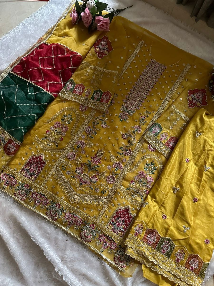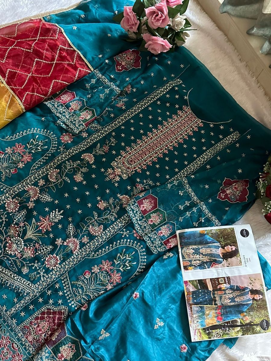| FABRIC DETAILS | Top: orgnza with havy embroidery work with hand work havy hand work in this desginBottam: santoon with havy embroidered work garara work Dupatta : Orgenza with havy embroidery work |