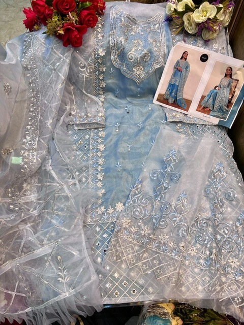 | DETAILS | *FABRICS :-* Top: ORGANZA EMBROIDERED WITH HEAVY HANDWORKED Sleeves:Embroidered with havy dimond Bottom:SANTOON WITH EMBROIDERY PATCHWORK PAYAL INNER:- HEAVY DULL SANTOON Dupatta:- FANCY STITCHED EMBROIDERED DUPATTA WITH PERAL WORK AND FOUR SIDED FRILL LACESet:- 2pis |