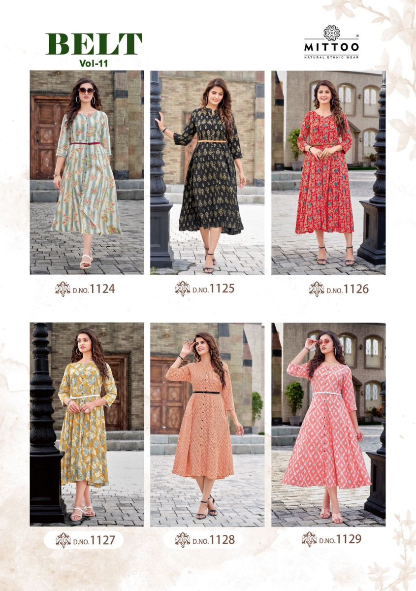 | DETAILS | ***Fabric Details* *Brand Name : MITTOO Catalog : BELT VOL 11 Design : 6 Fabric : Rayon Print Size : S(36), M(38), L(40), XL(42), XXL(44), XXXL(46) |