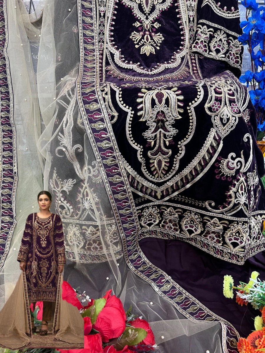FABRIC DETAILS :- Top: velvet with embroideryBottam:- reyon pasmina Dupatta : net with embroidery with less border with motiMOTIFZ 381 VELVET PAKISTANI SUITS MANUFACTURER