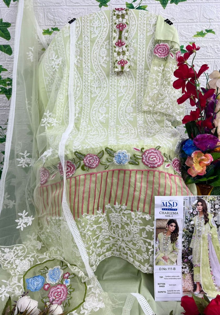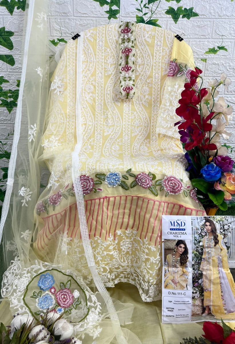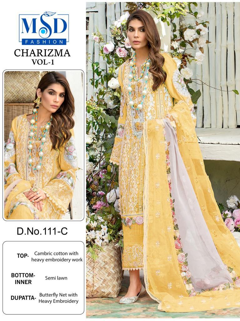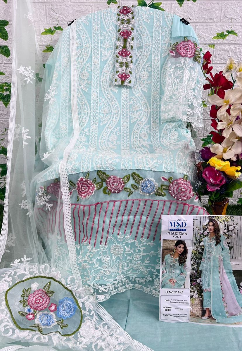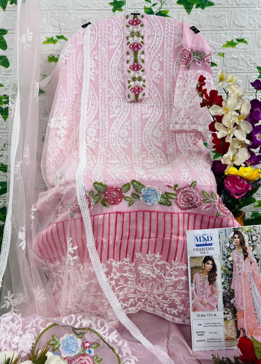 FABRIC DETAILS :- Top : CAMBRIC COTTON WITH HEAVY EMBROIDERY WITH MOTHIBottom : COTTONDupatta. : BUTERFLY NET WITH EMBRODERYMSD FASHION 111 CHARIZMA VOL 1 SERIES SALWAR SUITS