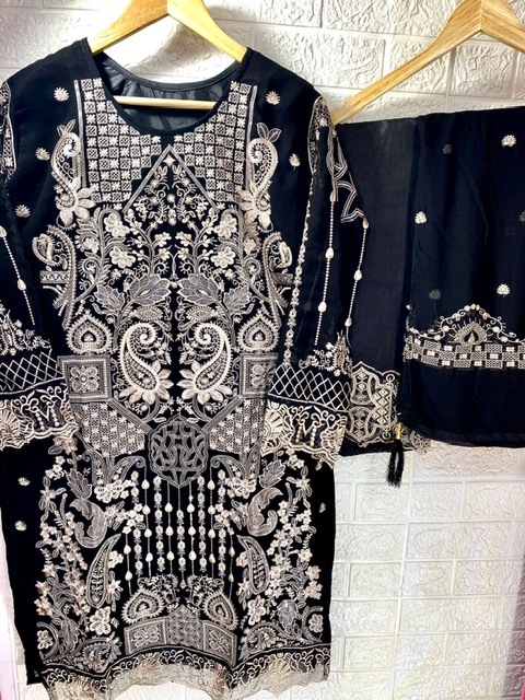 | DETAILS | *Fabric Details:* **Top*_ :- HEAVY FOX GEROGETTE EMBROIDERED _*Dupatta*_ :- HEAVY najmeen chiffon ( HEAVY EMBROIDERY WORK) with tussel*_INNER_*:- SANTOON_*Bottom*_ :- DALL COTTON SANTOON with work full stich.*Size*-XL *4 BEST COLOUR* |