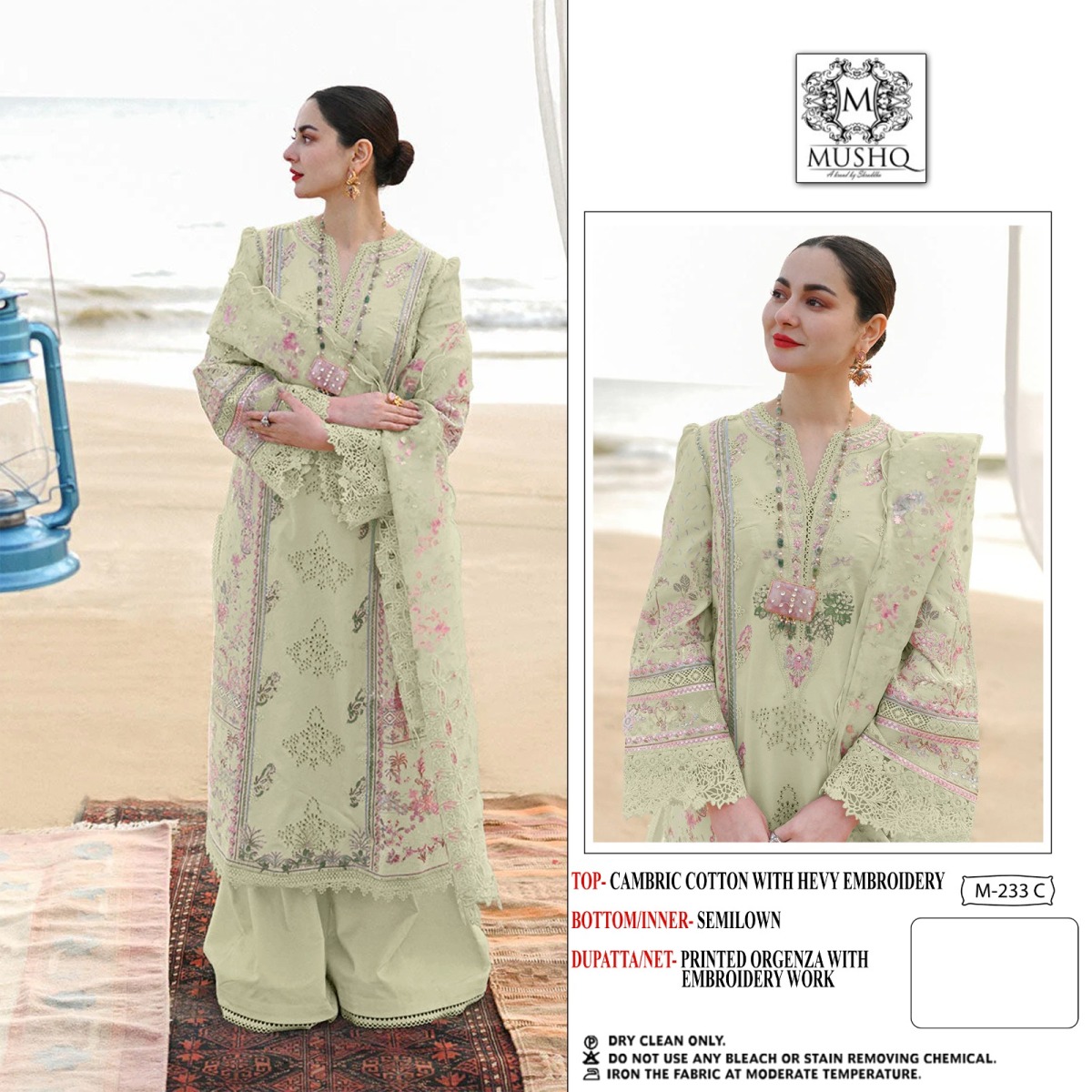 FABRIC DETAILS :- Top :- PURE COTTON EMBROIDERED CHIKAN WORK WITH DiemendDupatta :- BUTTER FLY NET EMBROIDERY DUPTA /d.no 233-orngza digital print with workBottom :- SEMI COTTONMUSHQ M 233 C PAKISTANI SALWAR SUITS