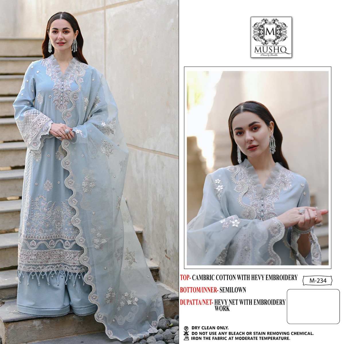 FABRIC DETAILS :- Top :- PURE COTTON EMBROIDERED CHIKAN WORK WITH DiemendDupatta :- BUTTER FLY NET EMBROIDERY DUPTA /d.no 233-orngza digital print with workBottom :- SEMI COTTONMUSHQ M 234 PAKISTANI SALWAR SUITS