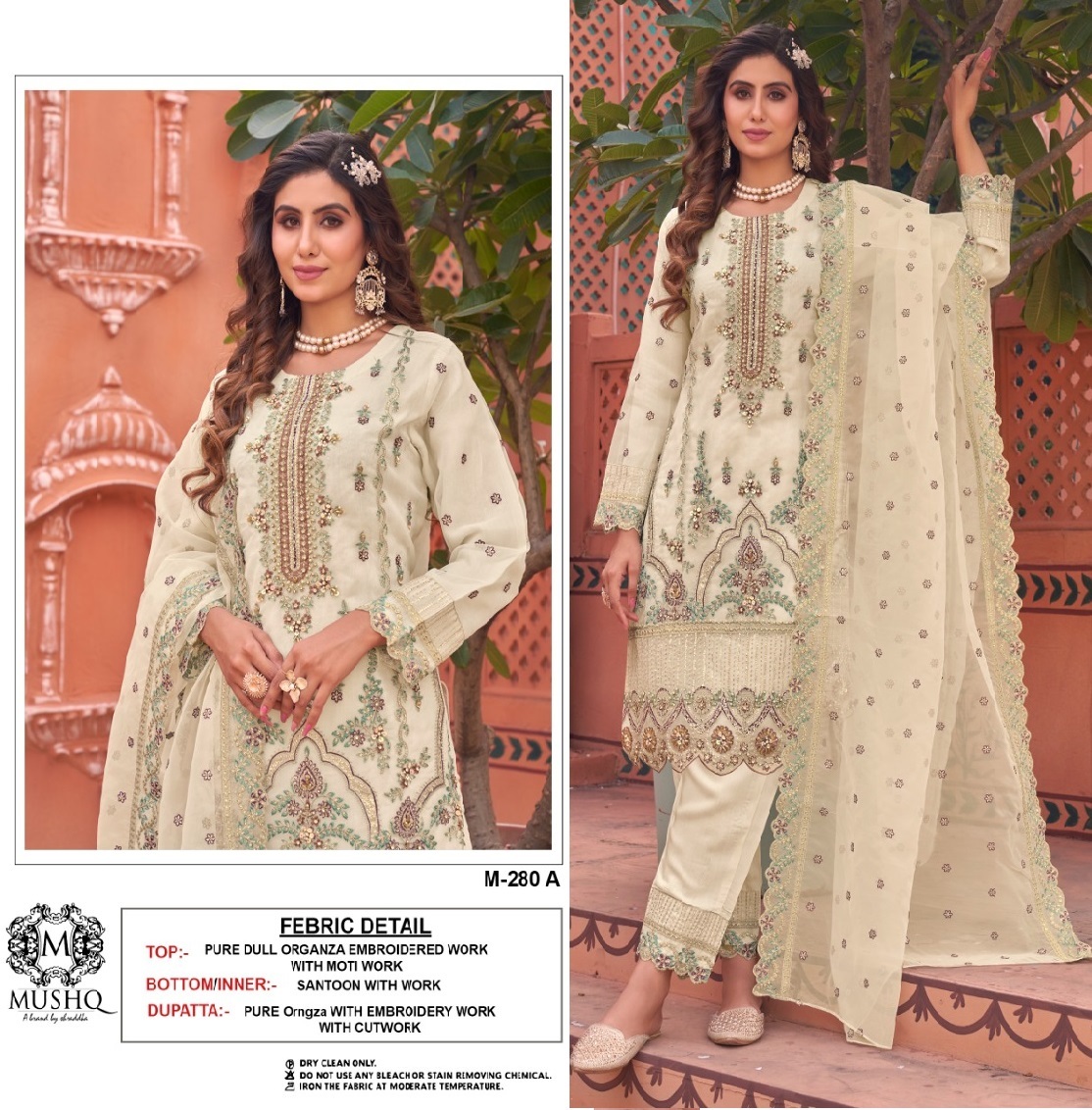 FABRIC DETAILS :- Top :- PURE ORGANZA EMBROIDERED WORK WITH Moti workDupatta :- PURE Orngza WITH EMBROIDERY WORK with cutworkINNER:- SANTOONBottom :- SANTOONMUSHQ M 280 A PAKISTANI SUITS MANUFACTURER
