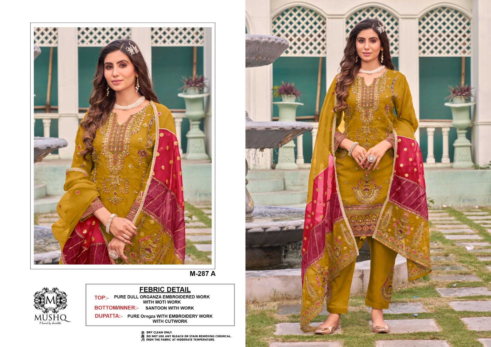 FABRIC DETAILS :- Top :- PURE ORGANZA EMBROIDERED WORK WITH Moti workDupatta :- PURE Orngza WITH EMBROIDERY WORK with cutworkINNER:- SANTOONBottom :- SANTOON with work MUSHQ M 287 A TO D PAKISTANI SALWAR SUITS