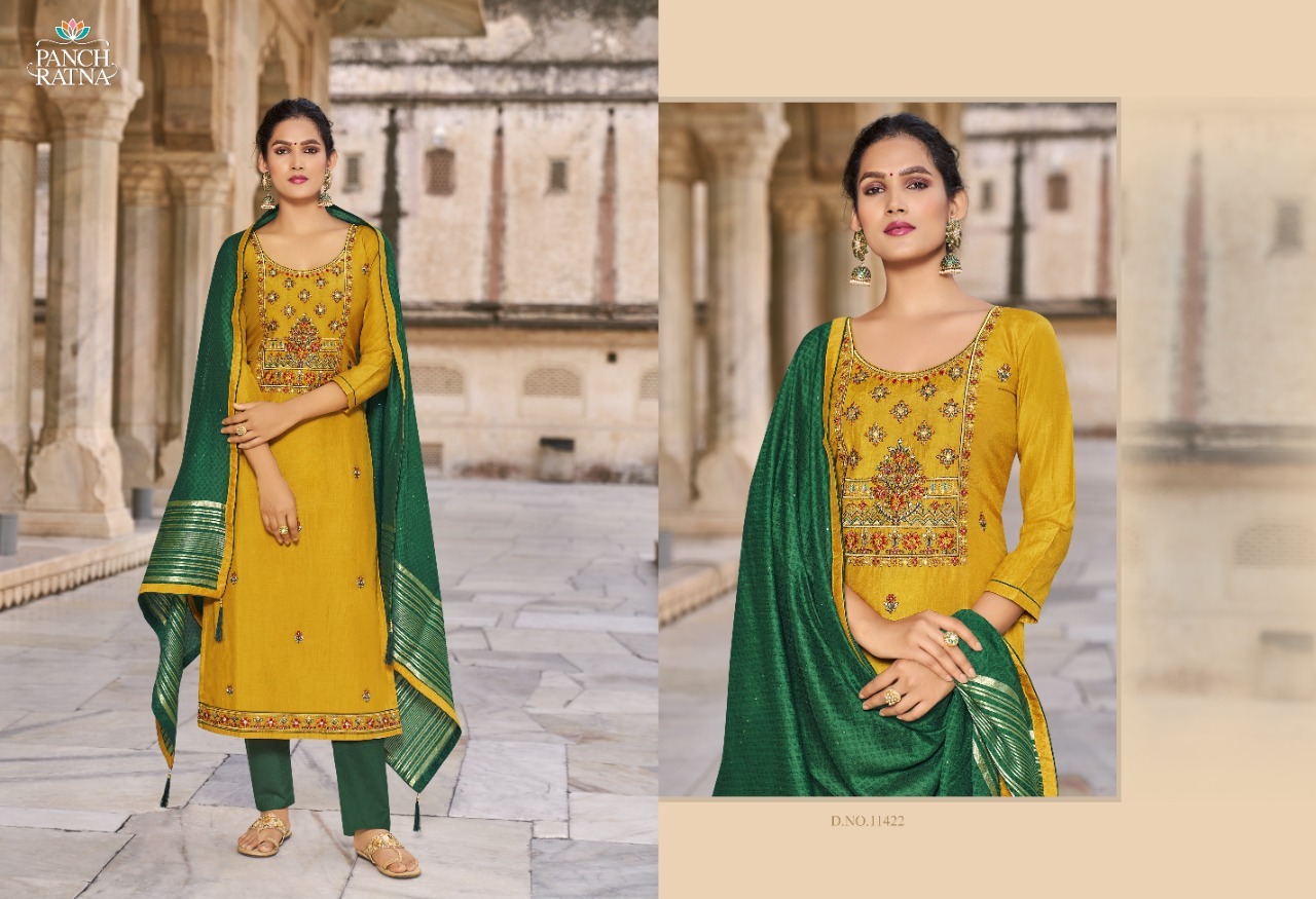 | DETAILS | Fabric Details Top :- Hevy Parampara Silk Work With Kantha WorkBottom :- Hevy ReyonDupatta :- Self Jacquard 3mm Sequence With Four Side BorderTotal Design:- 5 |