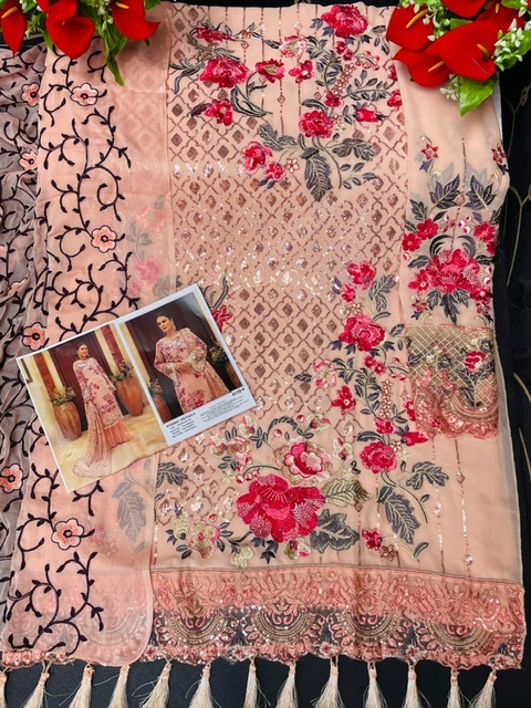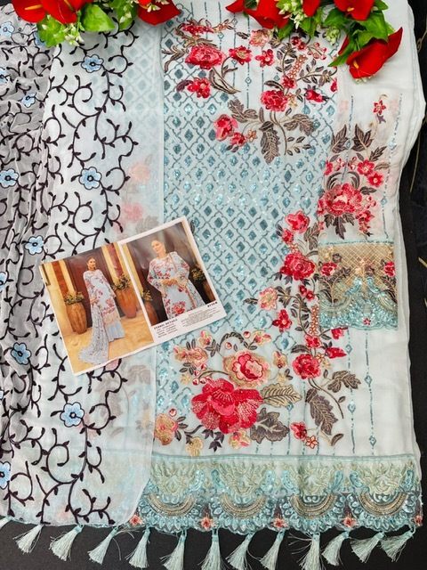 | DETAILS | *--: Fabric Details :--*Top :- Heavy Fox Georgette With Sequence Emb.siramik stone work Bottom :- Santoon Inner :- Santoon Dupatta :- Najneen Chain StitchWith Work |