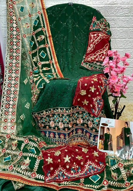 | DETAILS | **FABRICS DETAIL:- TOP:- *GEORGET WITH HEAVY EMBROIDERY* BOTTOM:- *DULL SANTOON* DUPPTA:- *NET EMBROIDERED* |