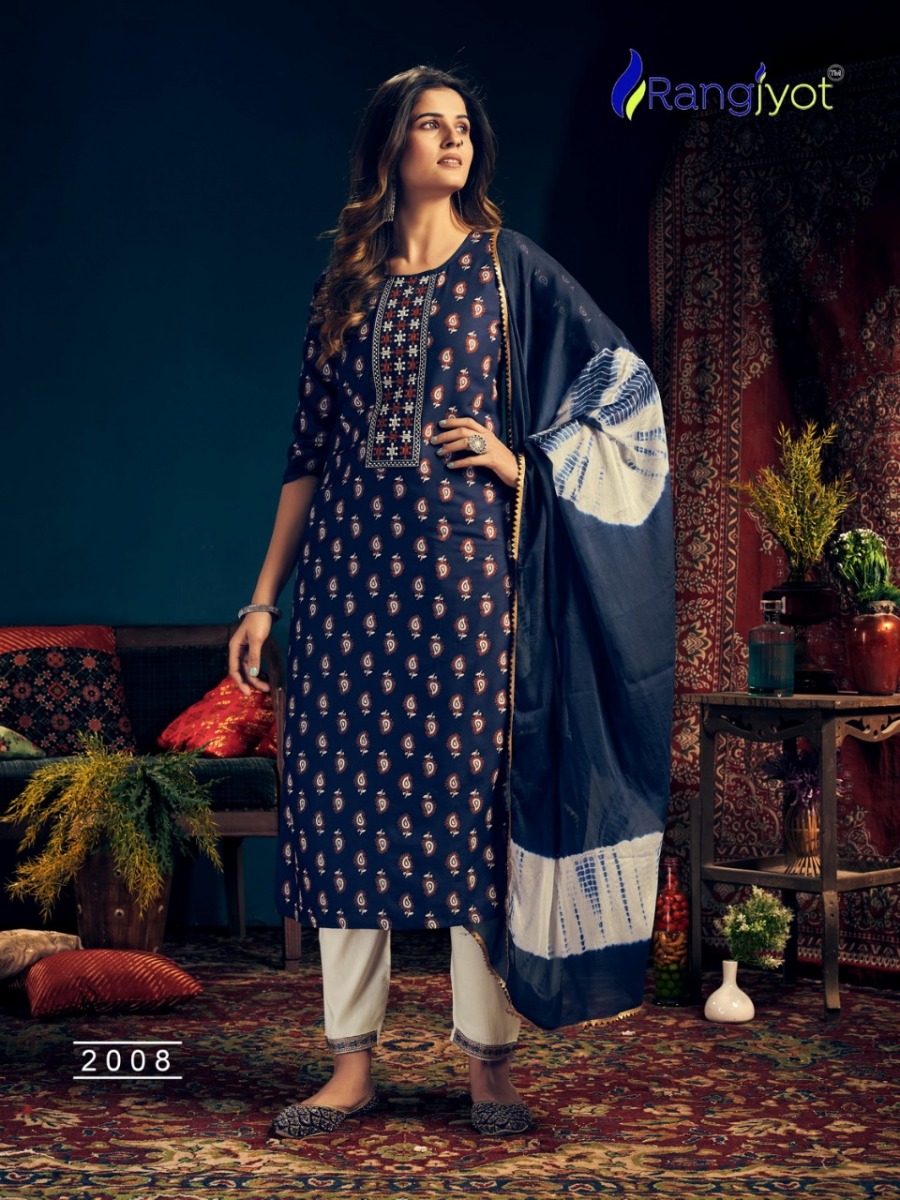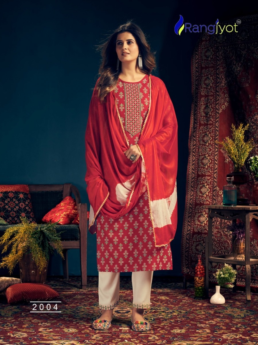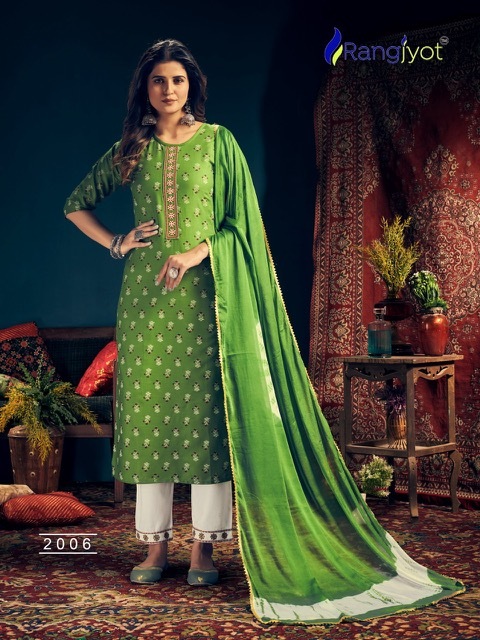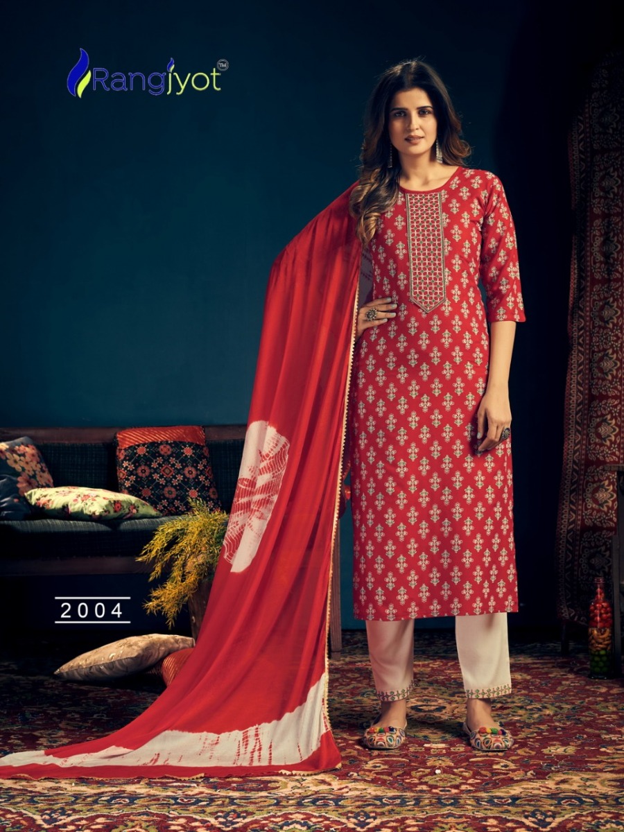 | DETAILS | *Catlouge Name :- *Rangmaya Vol-2* Design :- 8 pis.Top :- Rayon Print with tie patti work Pent :- Rayon 14 kg with beautiful work.Dupatta :- Chinon Siburi With Four Side Lace. Size :- M to 3xl |