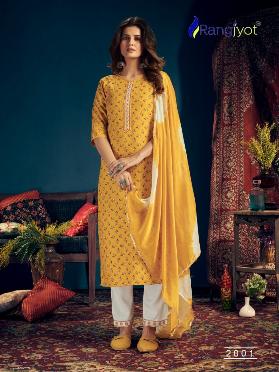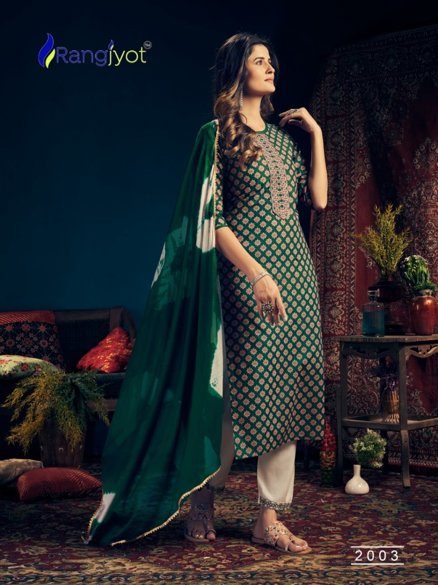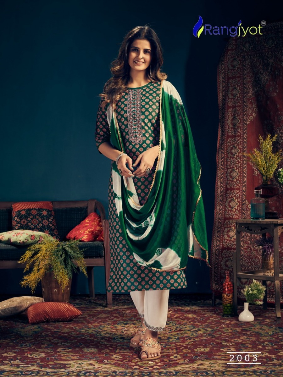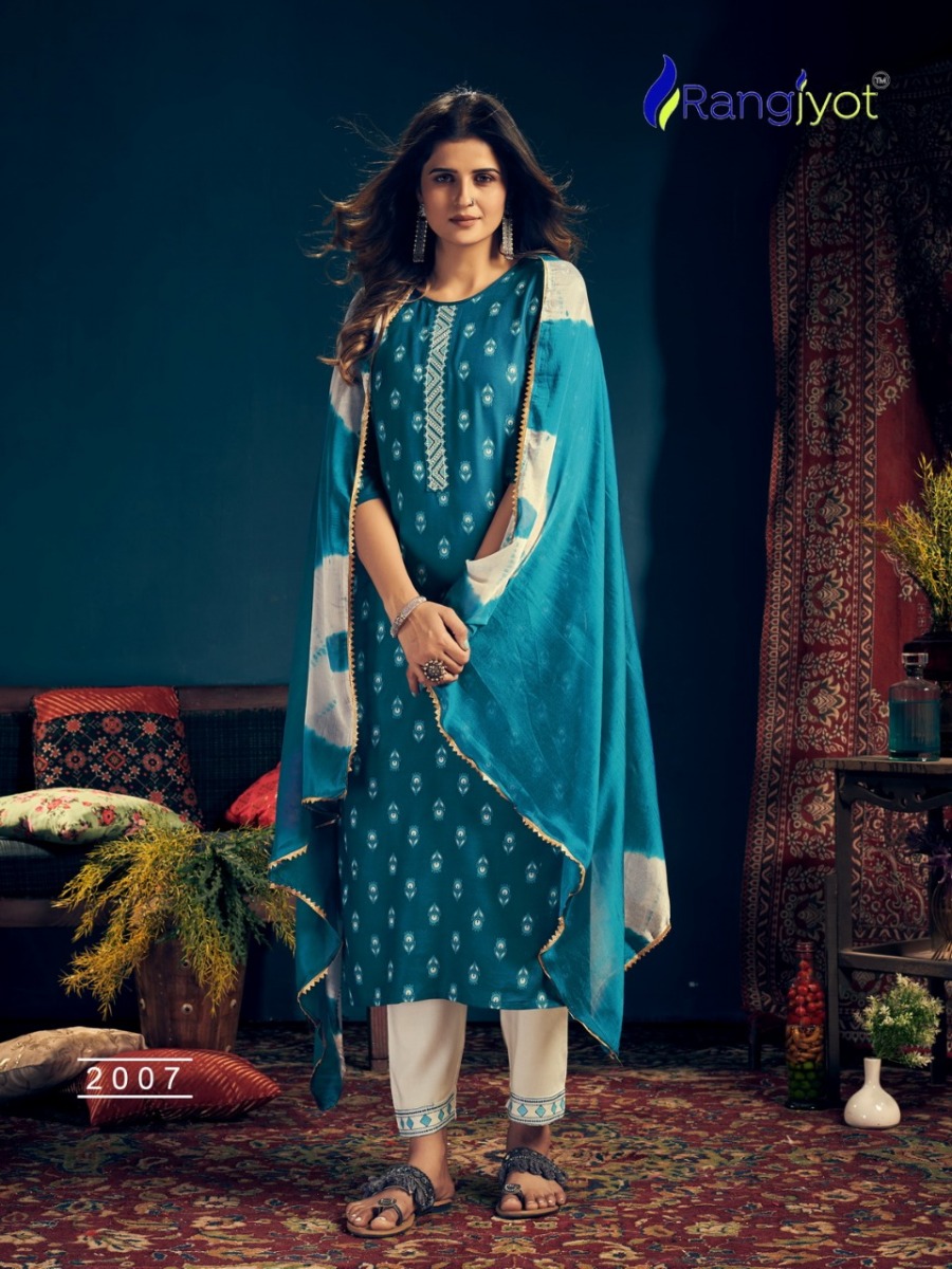 | DETAILS | *Catlouge Name :- *Rangmaya Vol-2* Design :- 8 pis.Top :- Rayon Print with tie patti work Pent :- Rayon 14 kg with beautiful work.Dupatta :- Chinon Siburi With Four Side Lace. Size :- M to 3xl |