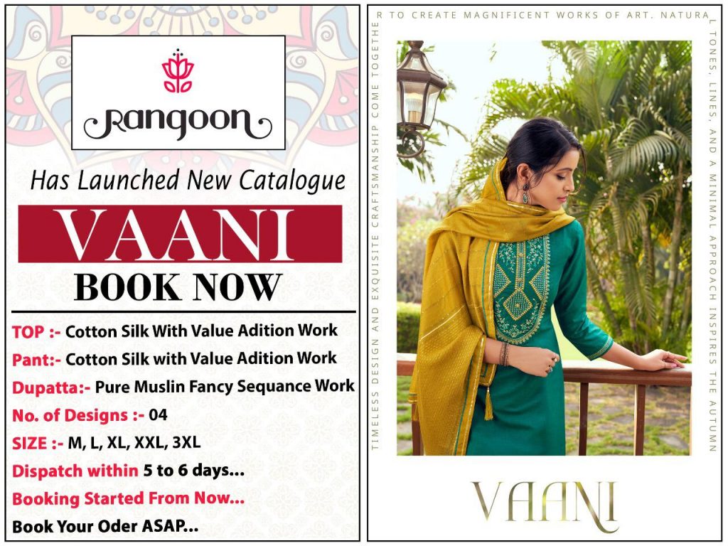| DETAILS | RANGOON has launched ? Fabric Details ? ▪Top:- Cotton Silk with Value Adition Work ▪Bottom:- Cotton Silk with Value Adition Work ▪Dupatta:- Pure Muslin Fancy Sequence Work ▪Total Design:- 04 ▪Size:- M, L, XL, XXL, 3XL |
